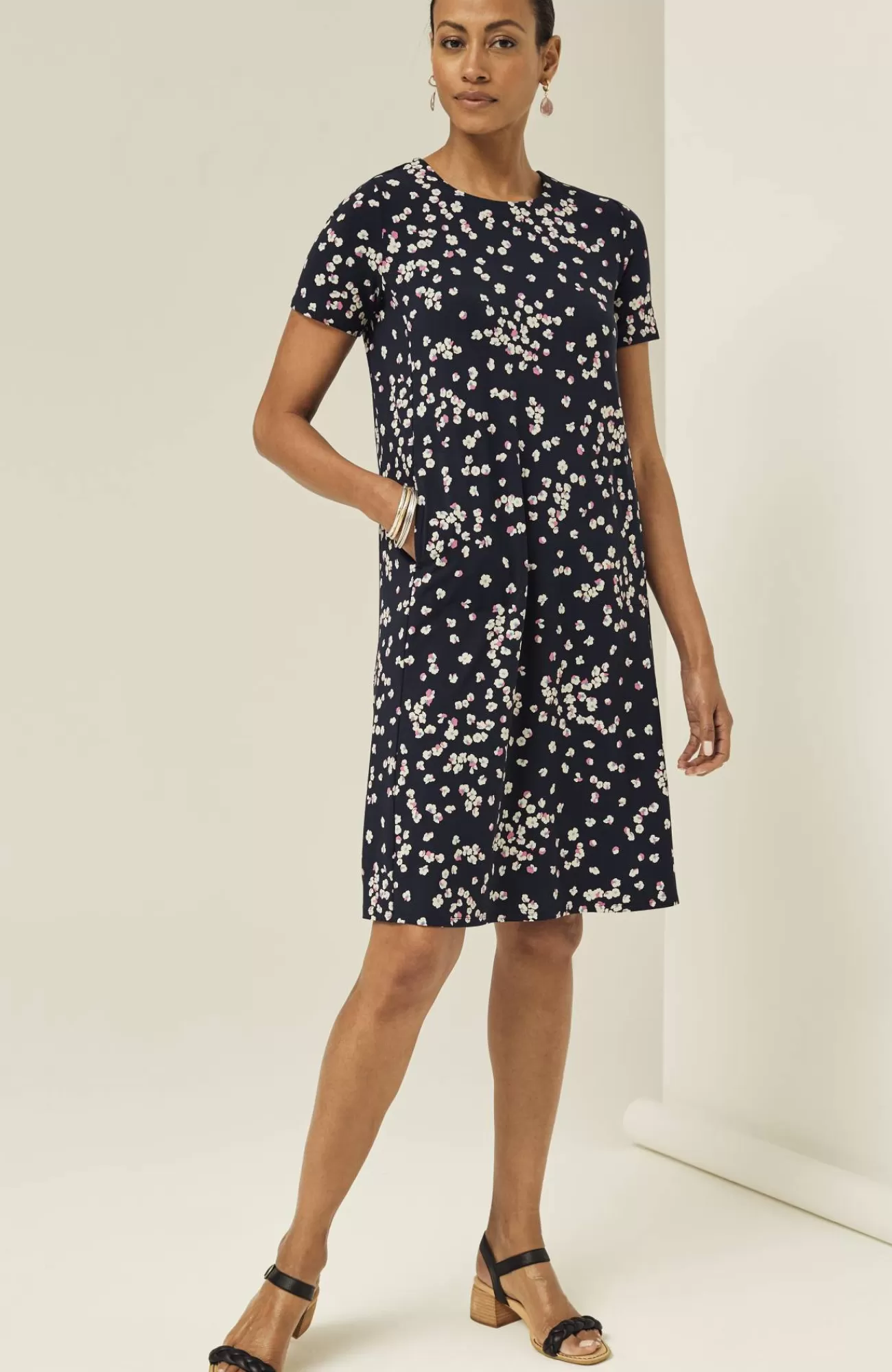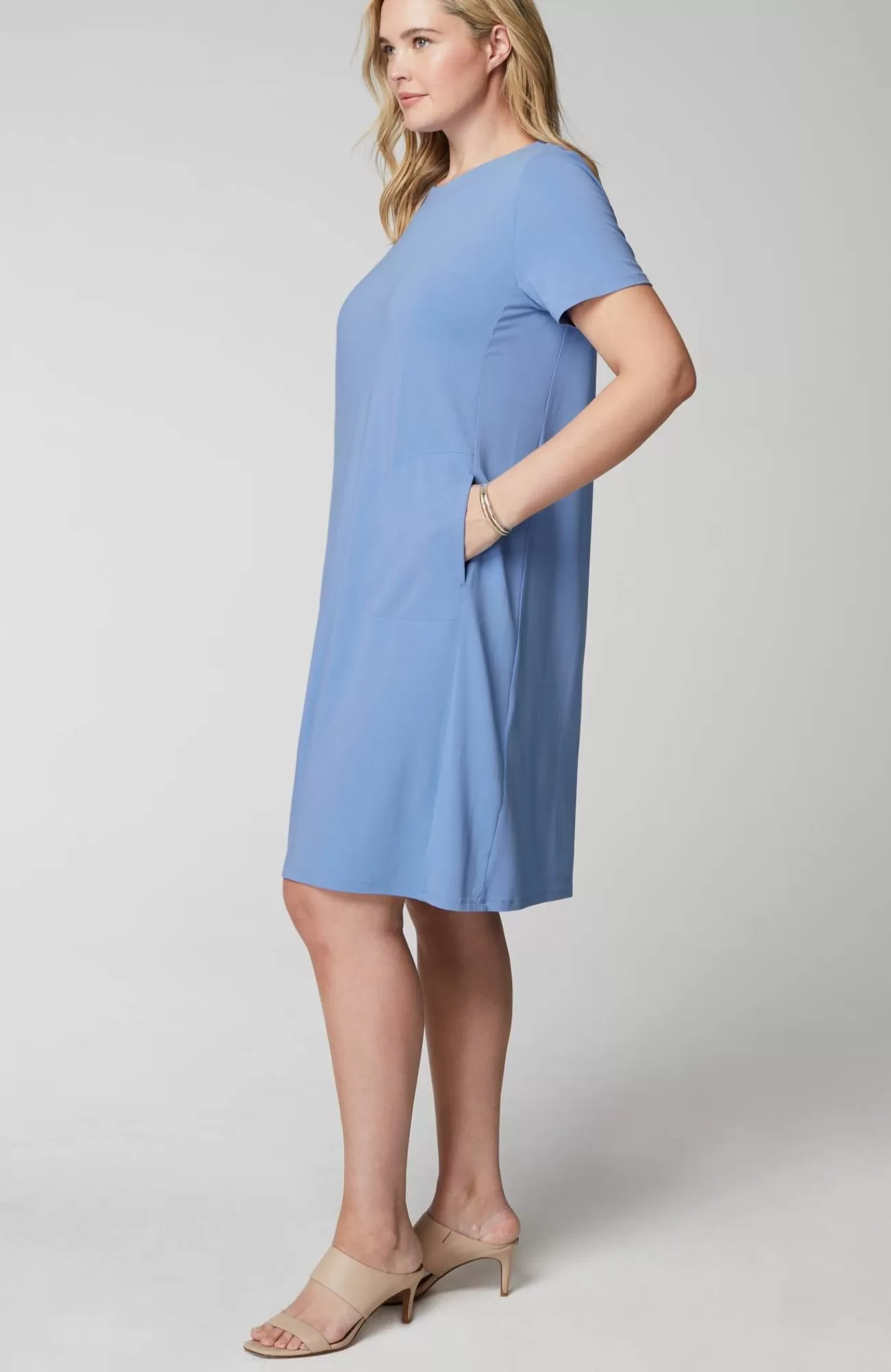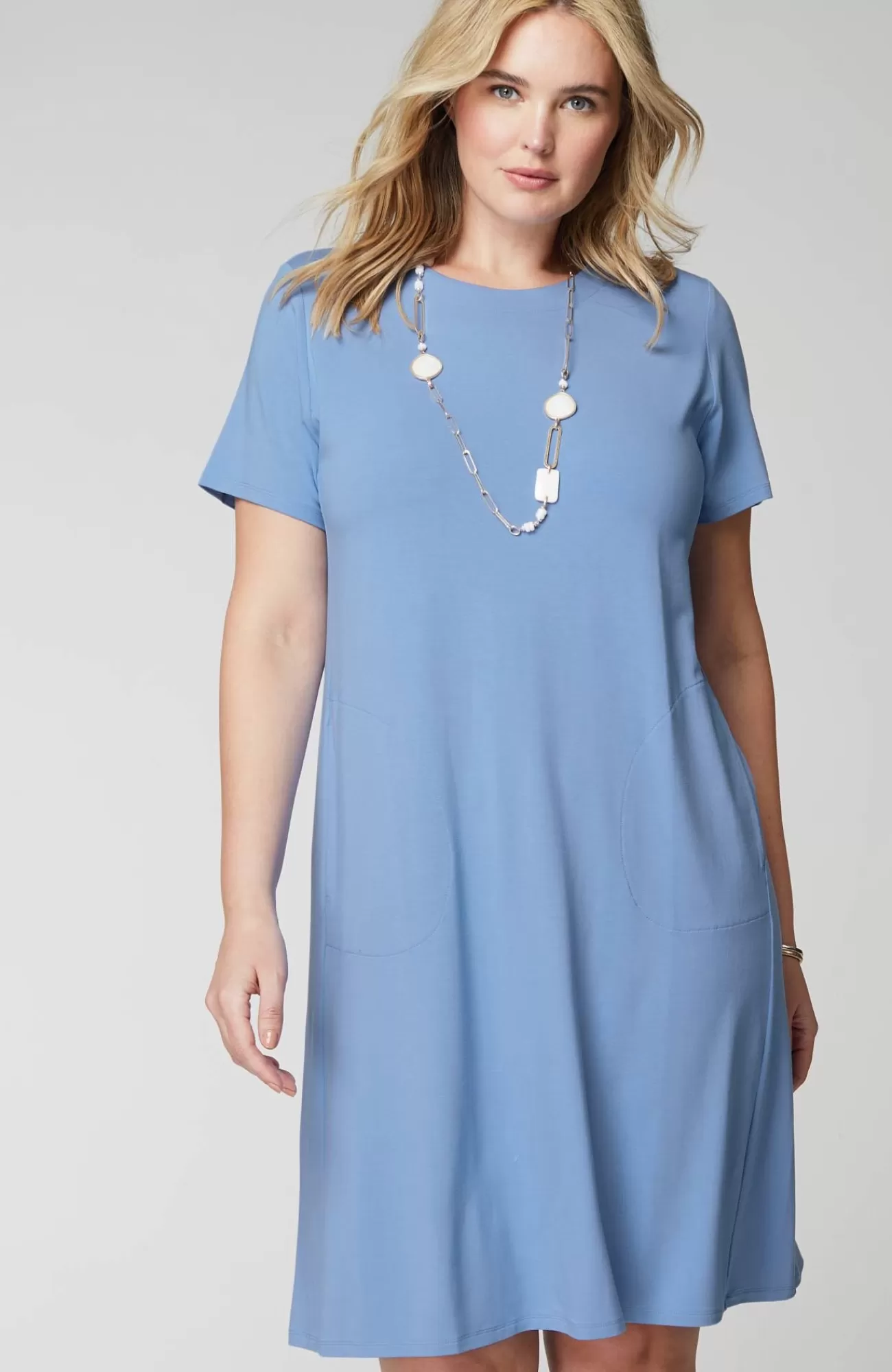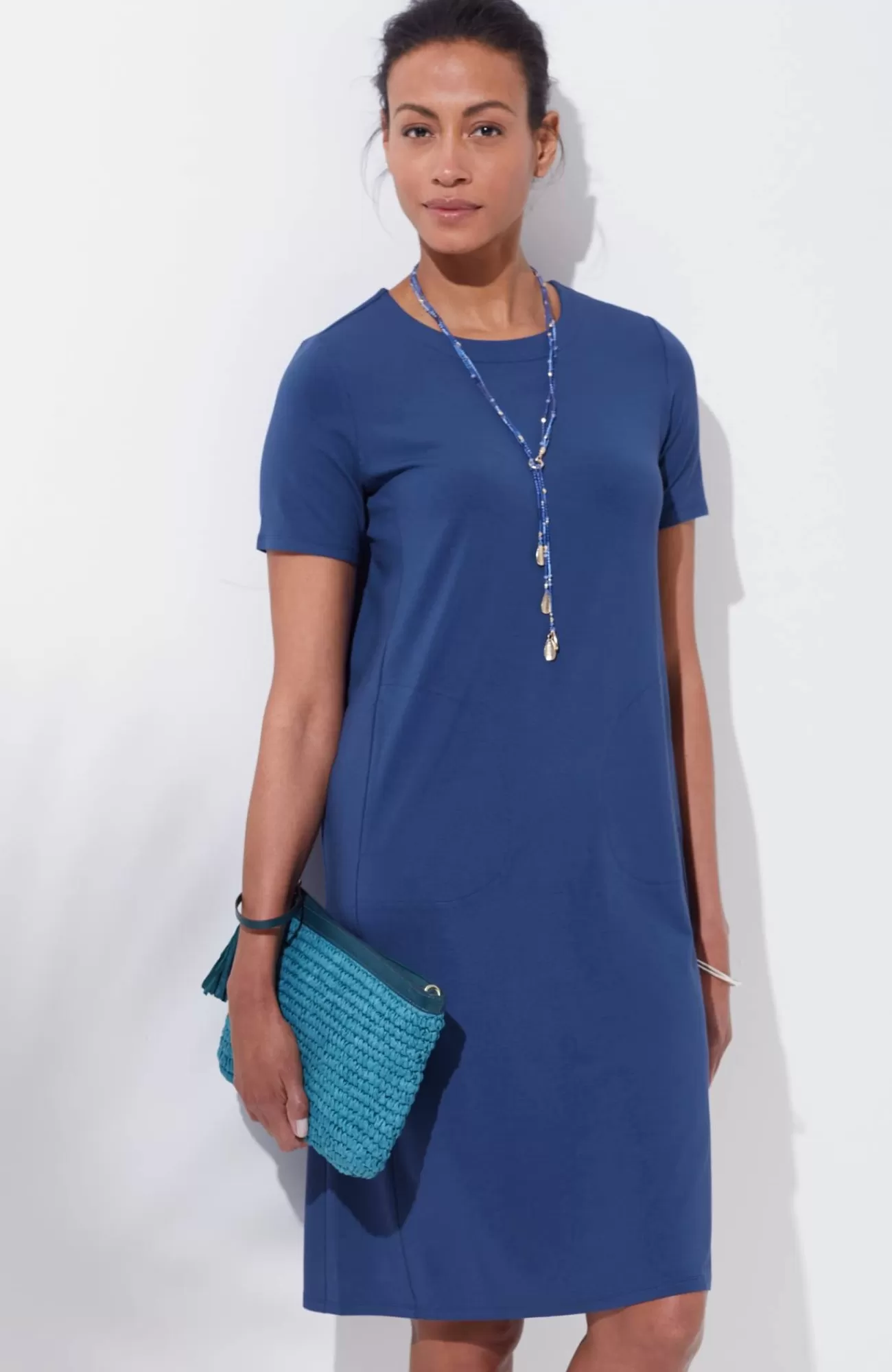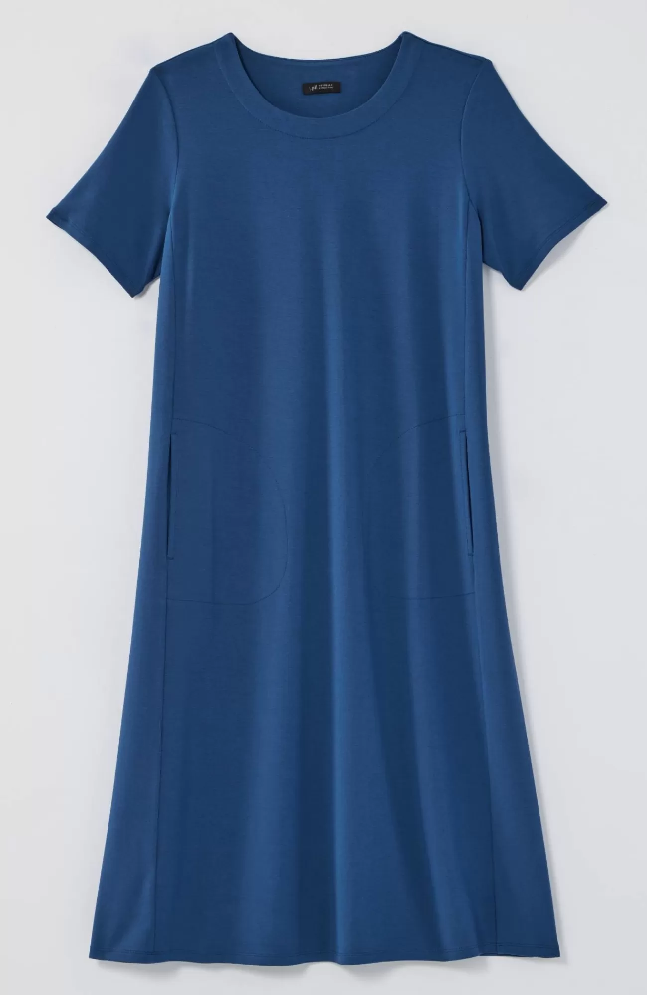 Designed from incredibly soft yarns, our easy T-shirt dress is made to move throughout your day, no matter where it takes you. Dress it up with a jacket and accessories or keep it casual with a pair of sneakers. Side panels and a box pleat at the back yoke add elements of structure to the A-line shape. On-seam pockets hold small essentials. Crew neckline. Effortlessly packable knit style. Made from soft European yarns.