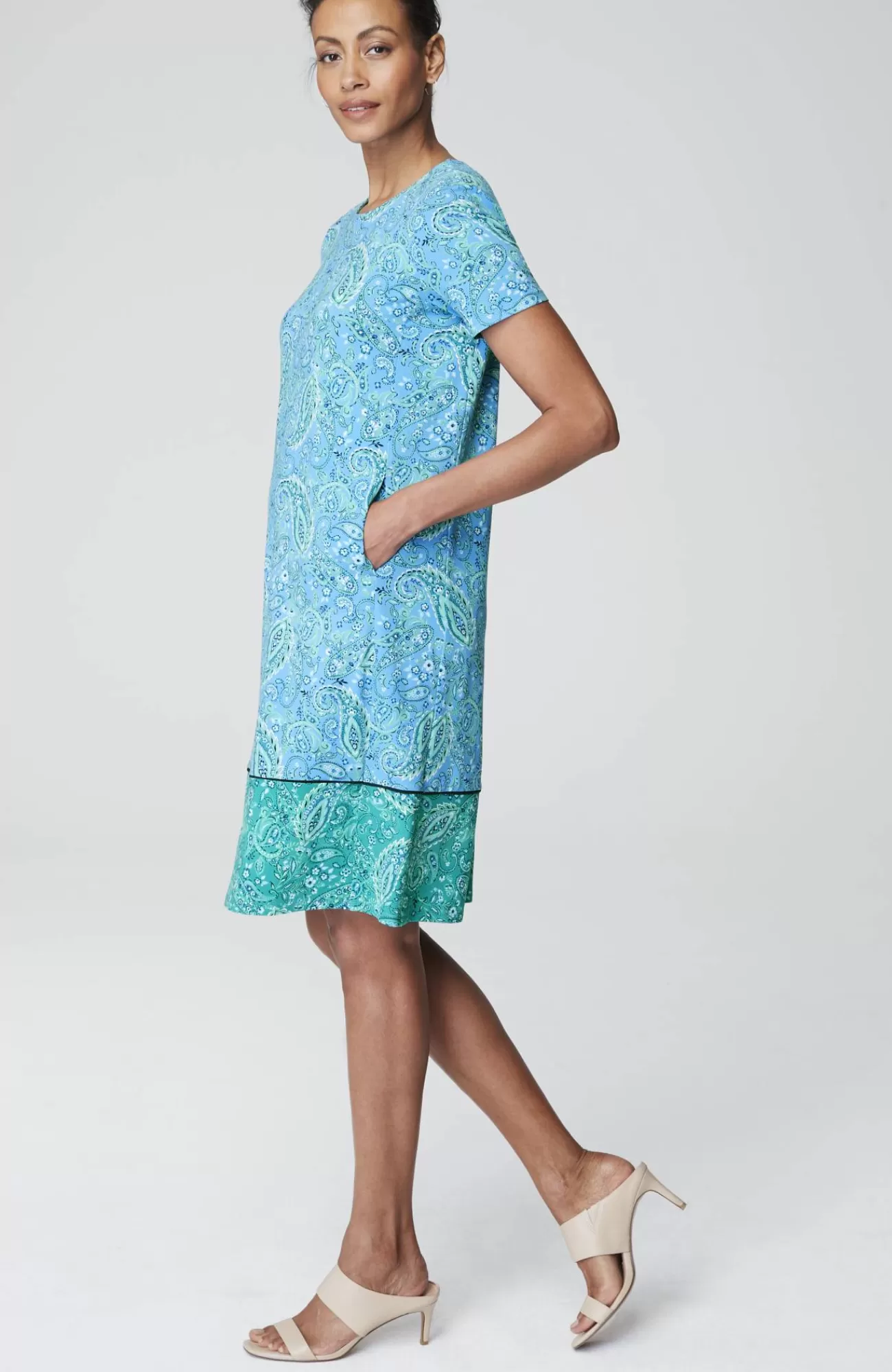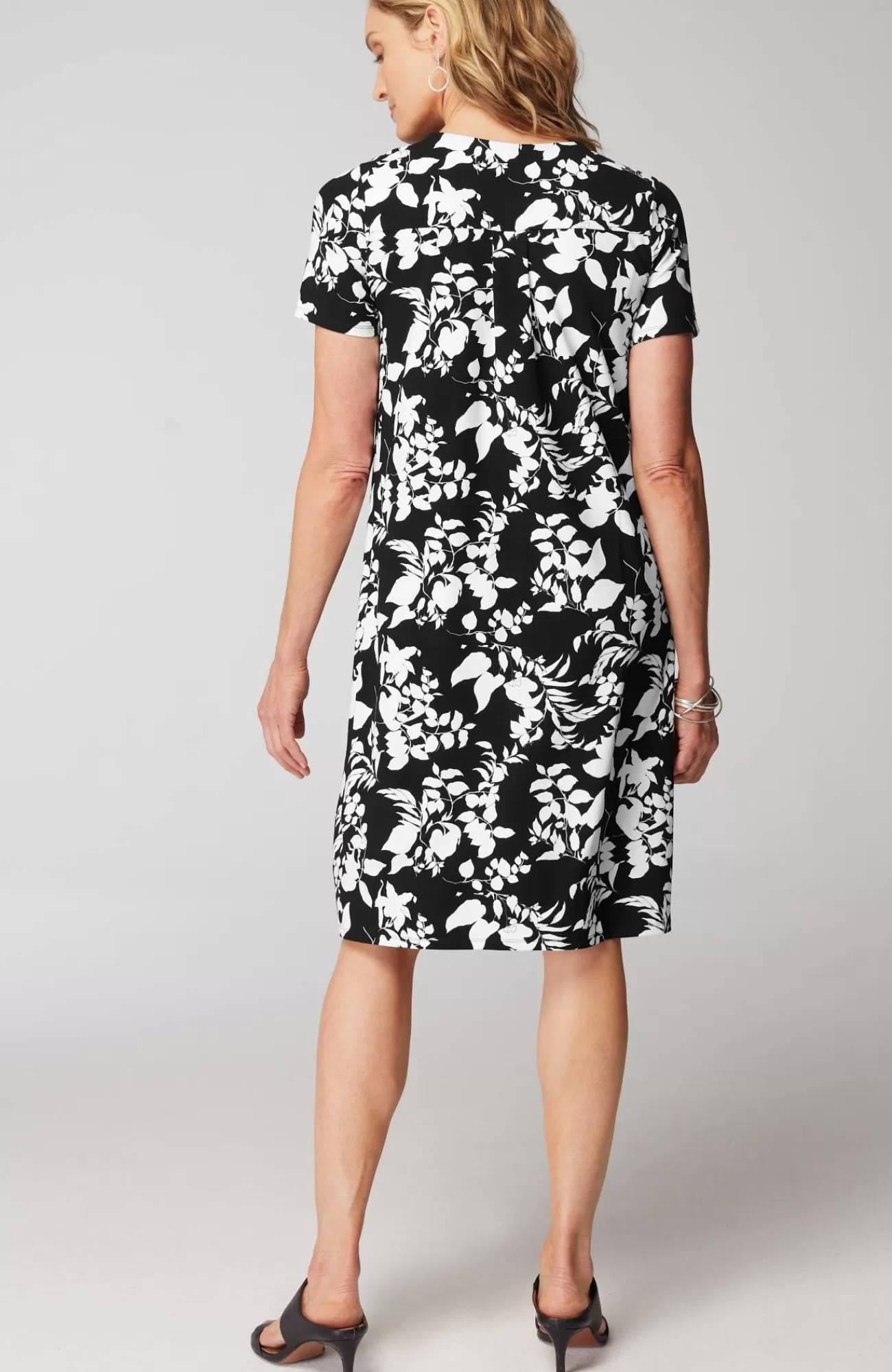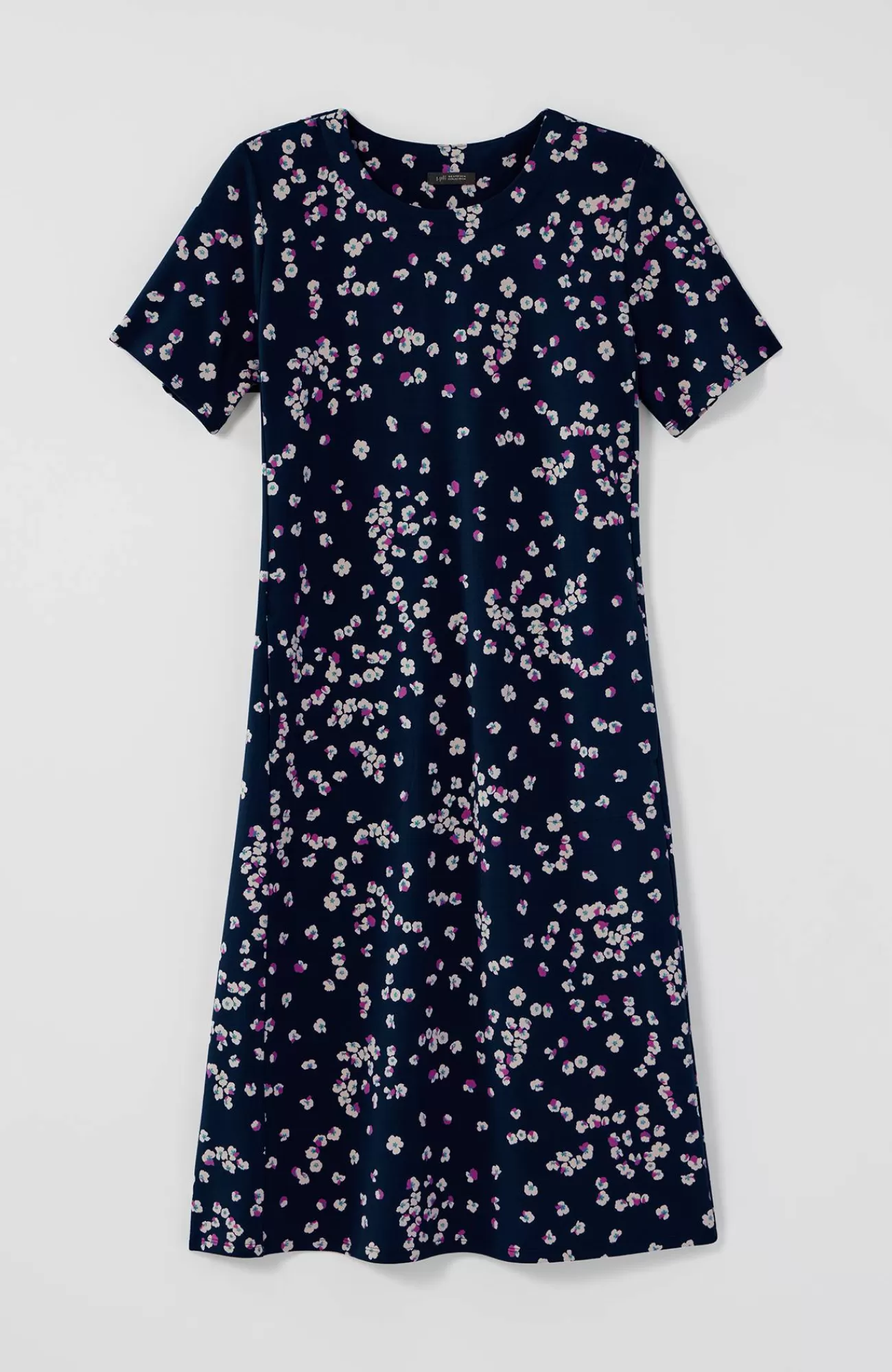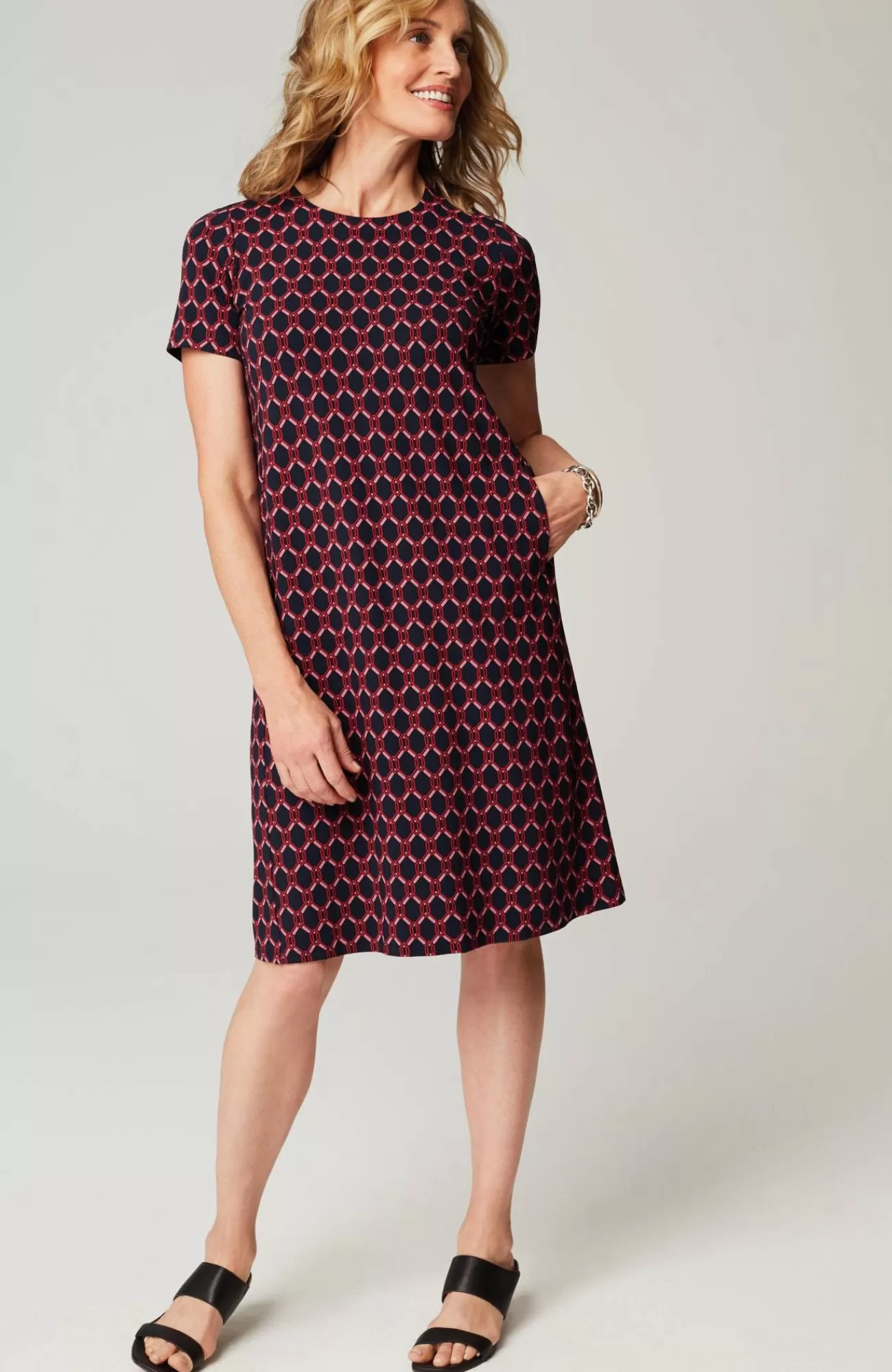 Designed from incredibly soft yarns, our easy T-shirt dress is made to move throughout your day, no matter where it takes you. Dress it up with a jacket and accessories or keep it casual with a pair of sneakers. Side panels and a box pleat at the back yoke add elements of structure to the A-line shape. On-seam pockets hold small essentials. Crew neckline. Effortlessly packable knit style. Made from soft European yarns.