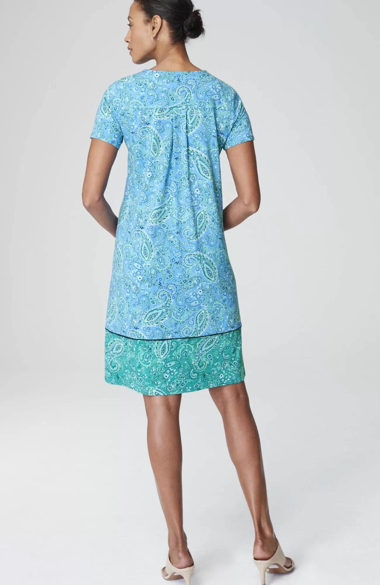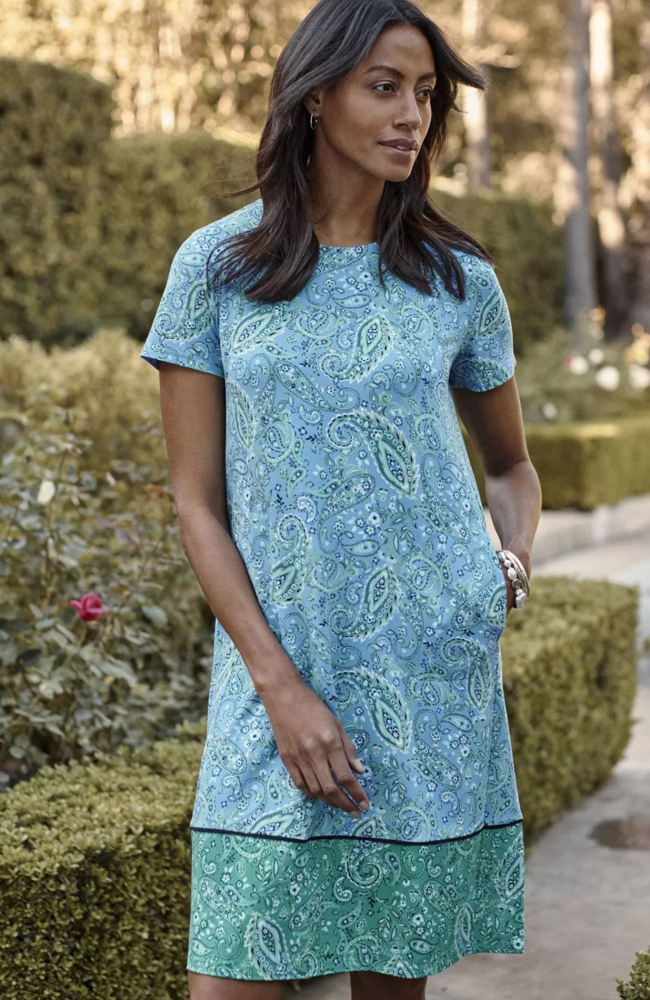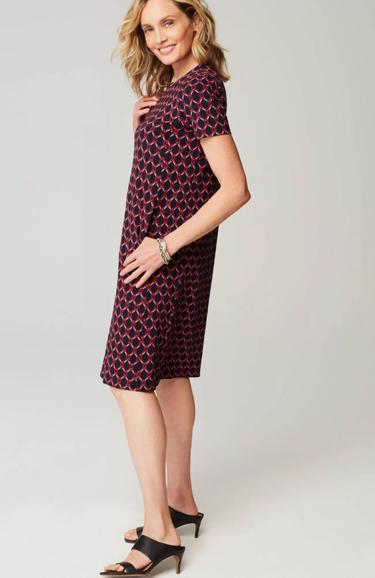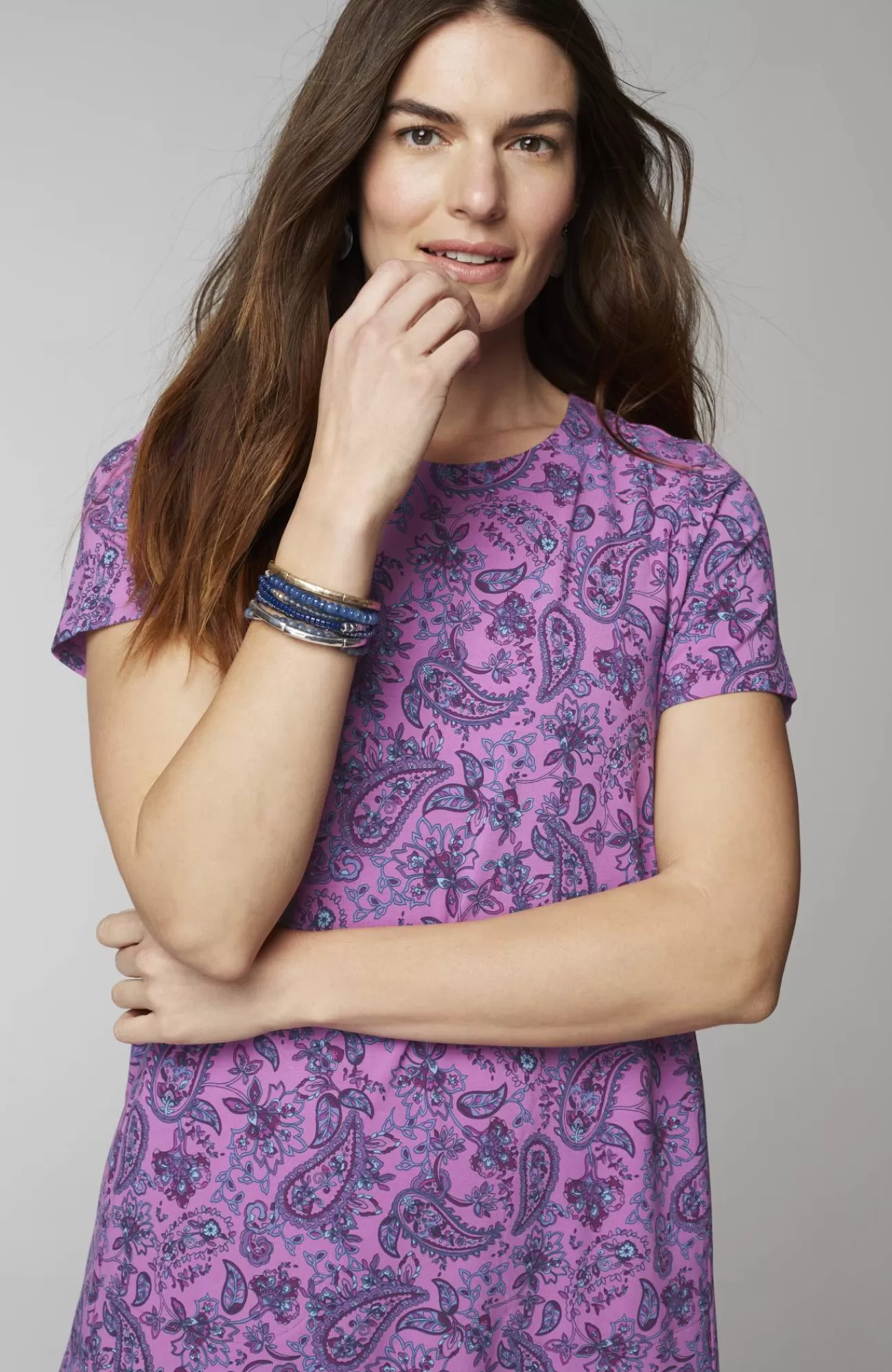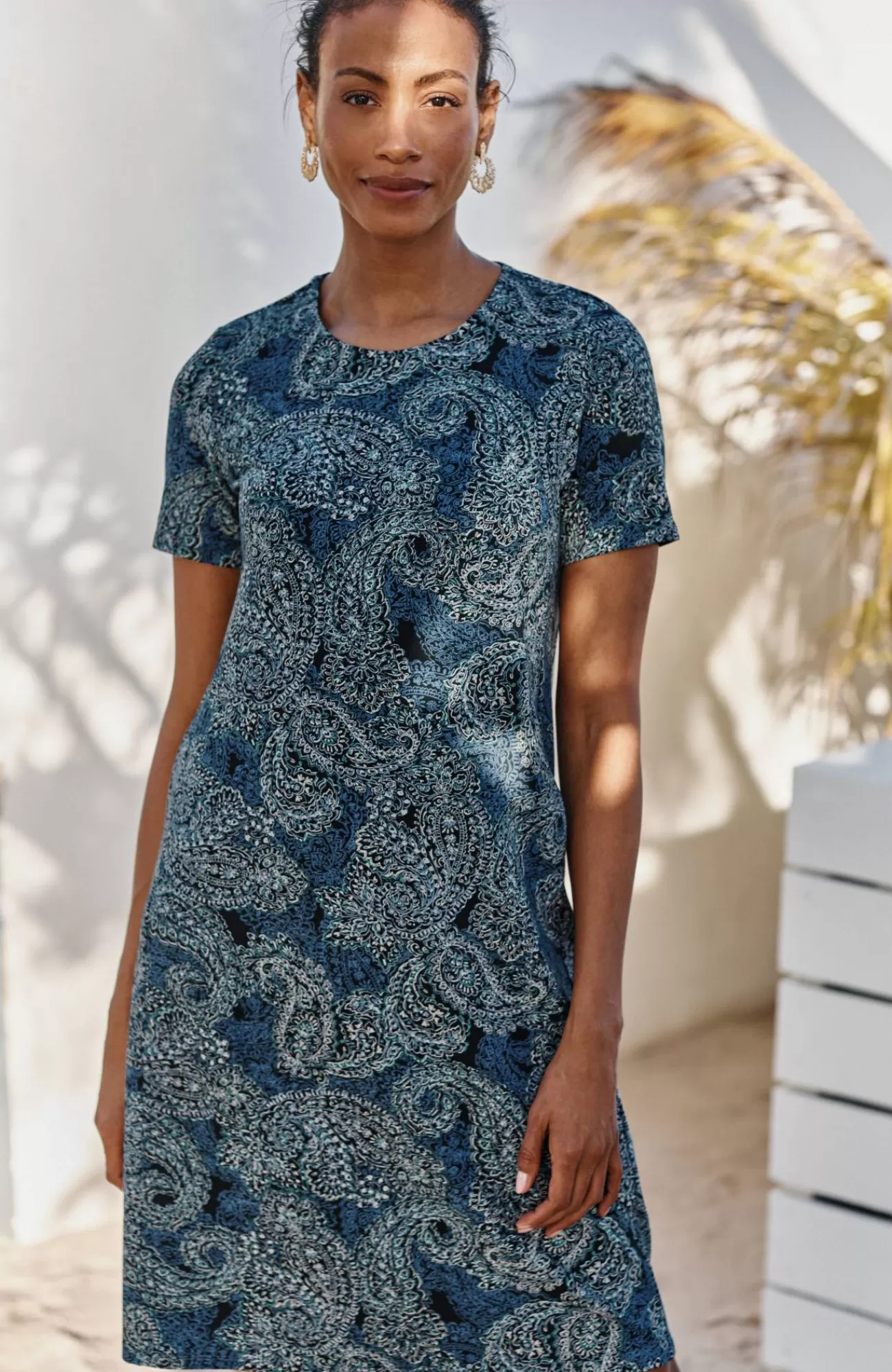 Designed from incredibly soft yarns, our easy T-shirt dress is made to move throughout your day, no matter where it takes you. Dress it up with a jacket and accessories or keep it casual with a pair of sneakers. Side panels and a box pleat at the back yoke add elements of structure to the A-line shape. On-seam pockets hold small essentials. Crew neckline. Effortlessly packable knit style. Made from soft European yarns.
