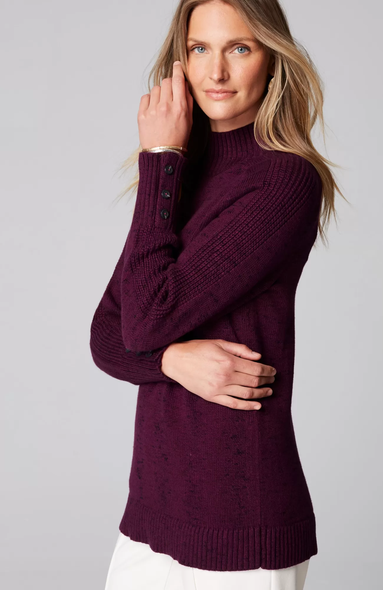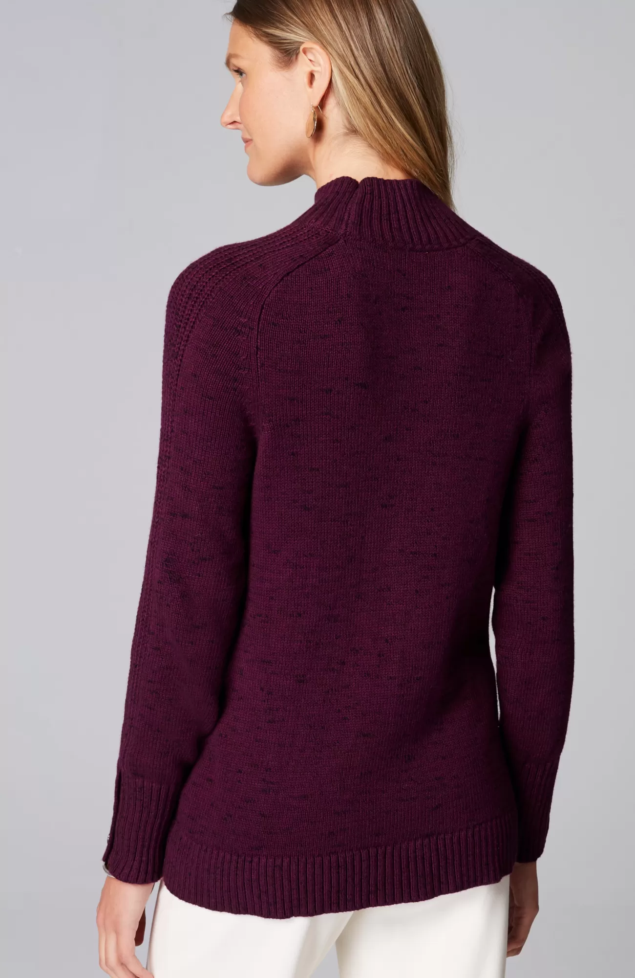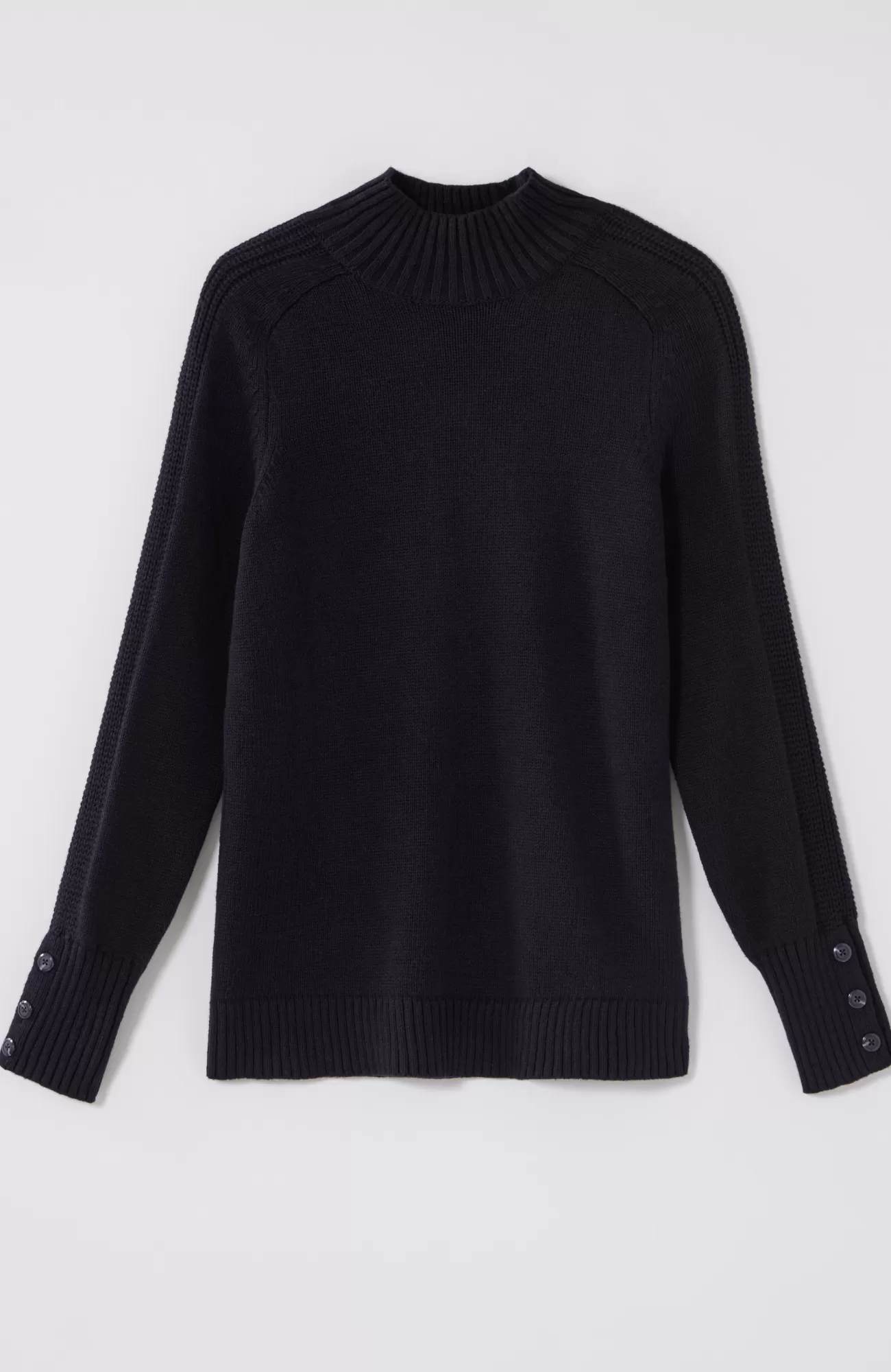 Understated yet rich in texture, our soft mock-neck sweater is a cozy necessity for fall. The saddle-sleeve silhouette is complemented by ribbed detailing along the arms and a trio of functional buttons at the cuffs. Finished with a ribbed neckline, cuffs and hem.