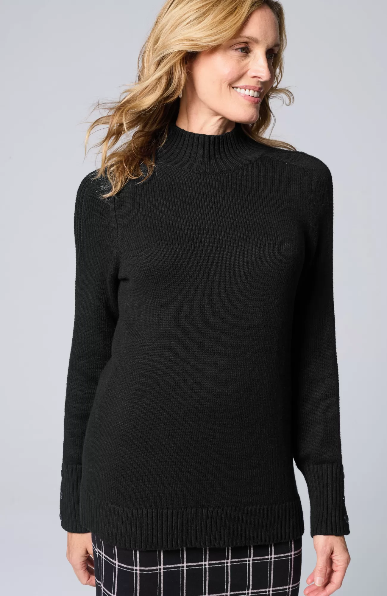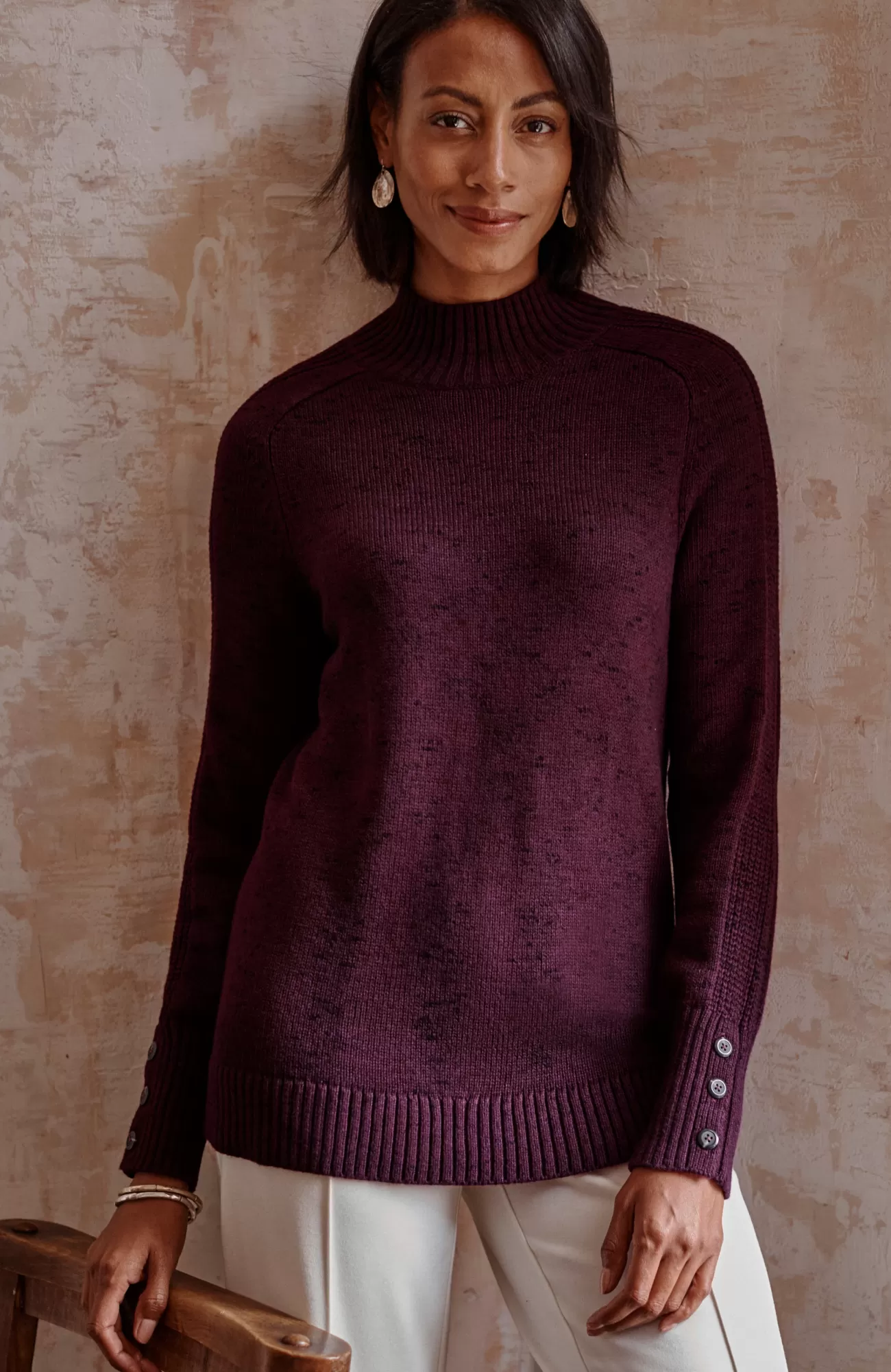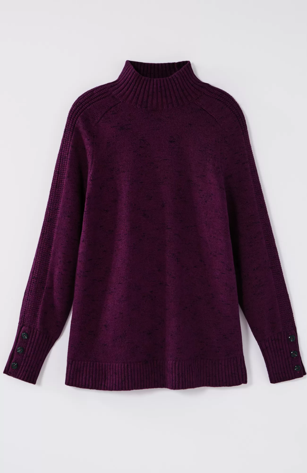 Understated yet rich in texture, our soft mock-neck sweater is a cozy necessity for fall. The saddle-sleeve silhouette is complemented by ribbed detailing along the arms and a trio of functional buttons at the cuffs. Finished with a ribbed neckline, cuffs and hem.