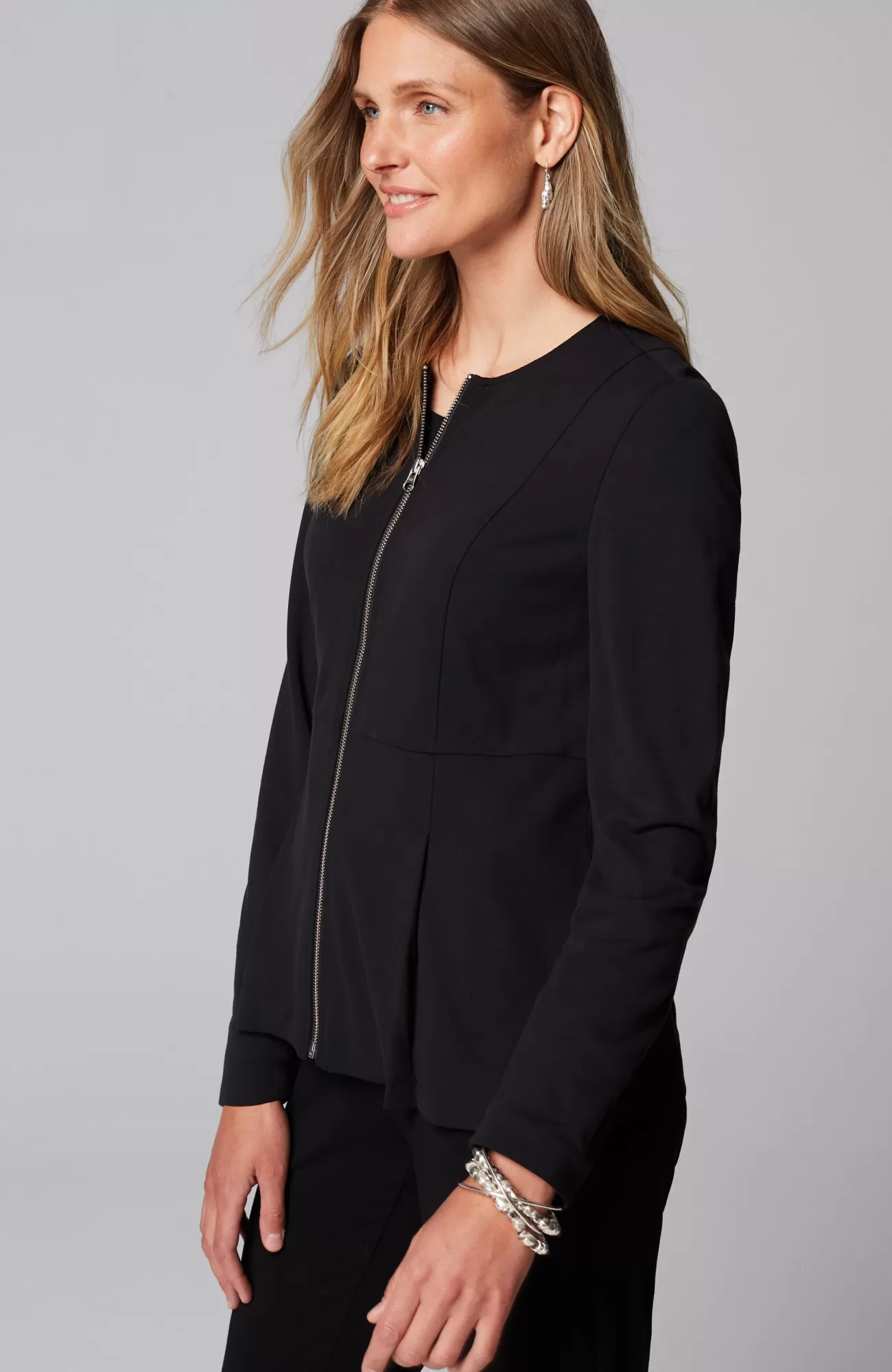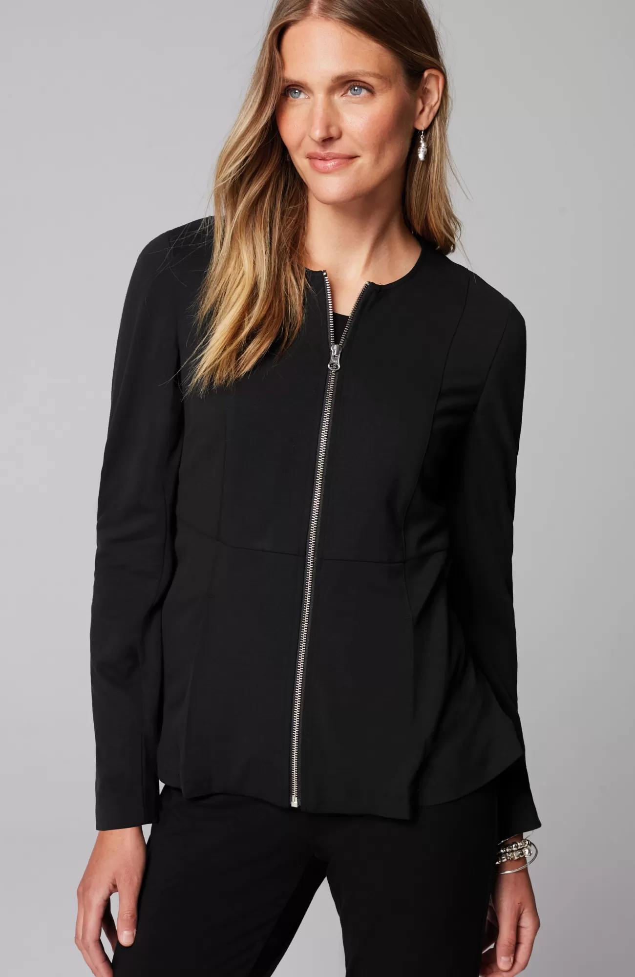 Part of our Wearever Works Collection, our cropped, full-zip jacket is the ideal layer to add to your wear-now wardrobe. Crafted from our soft yet structured double-face jersey fabric, it’s both refined and supremely comfortable. We added princess seams and peplum-style pleats for a touch of fun. Fully lined.
