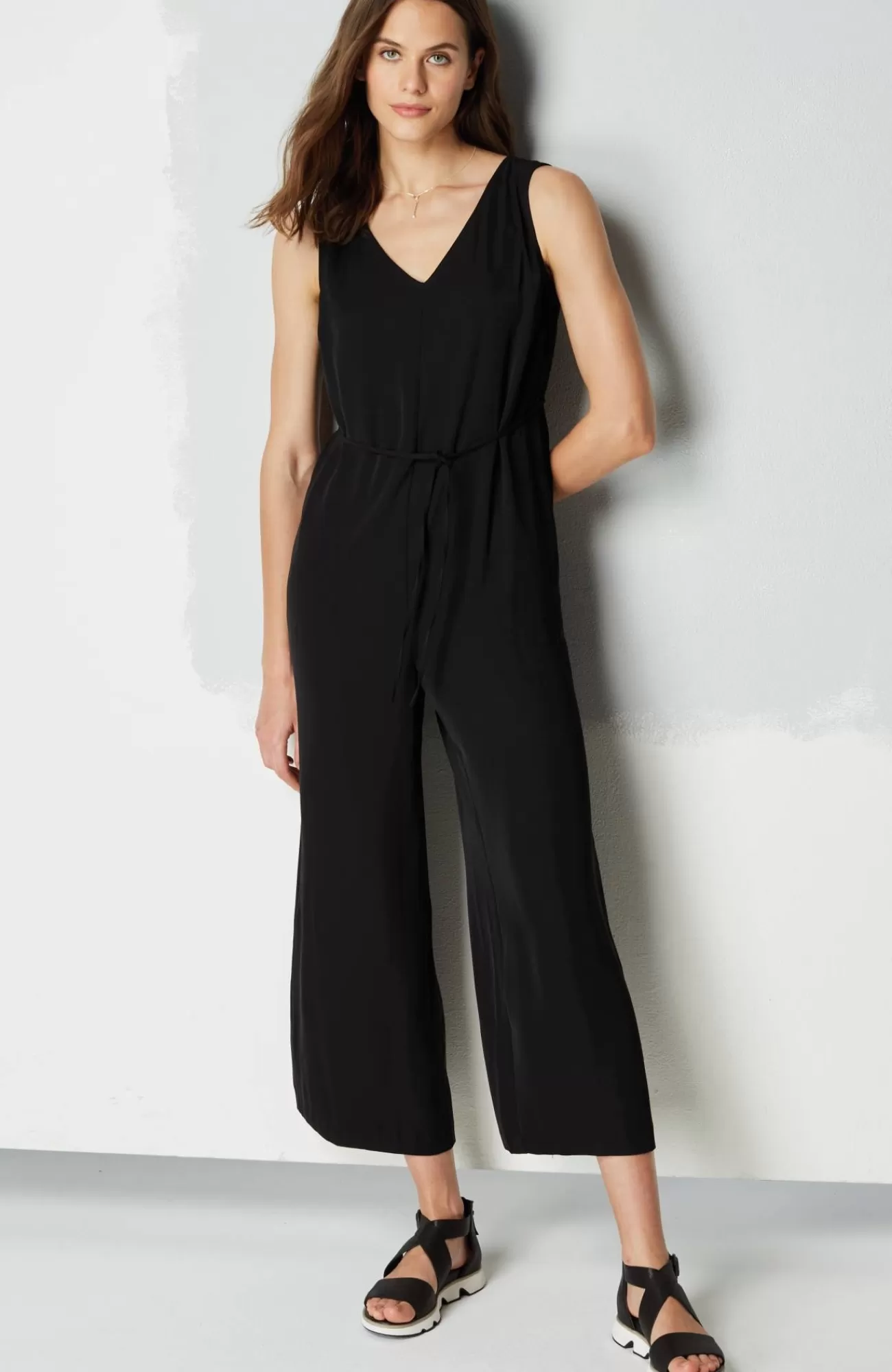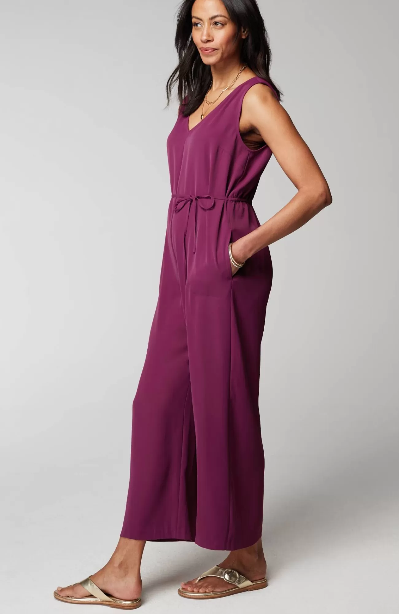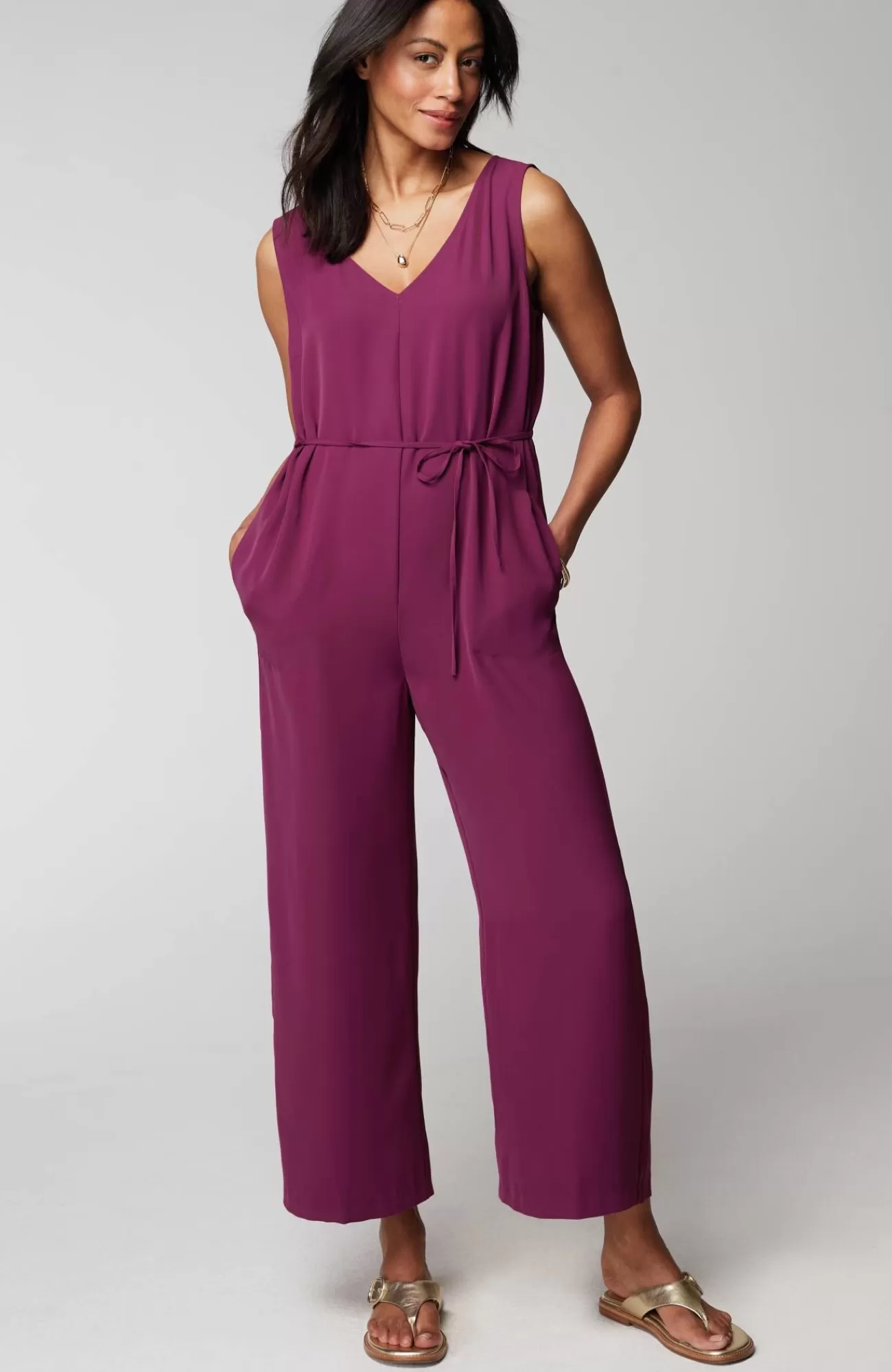 One-and-done dressing takes on a whole new level of comfort with our easy-care twill jumpsuit. You'll love the stylish double-V-neckline, while the cropped length lets you show off summer sandals or sneakers. The self-tie belt with channeled elastic at the back creates a custom flattering fit. On-seam pockets are perfect for holding small essentials. Invisible zipper at the center back. Sleeveless.