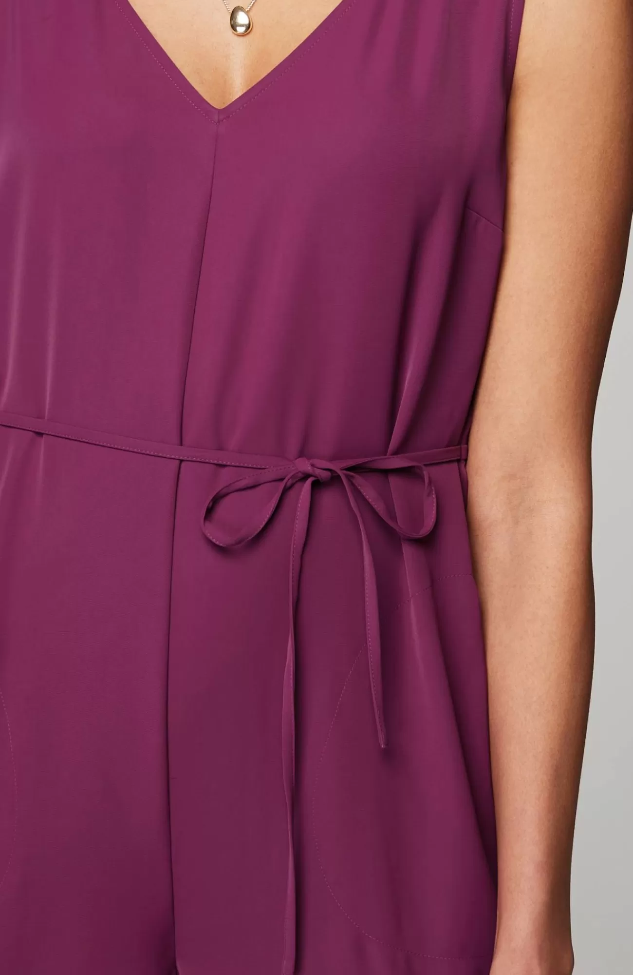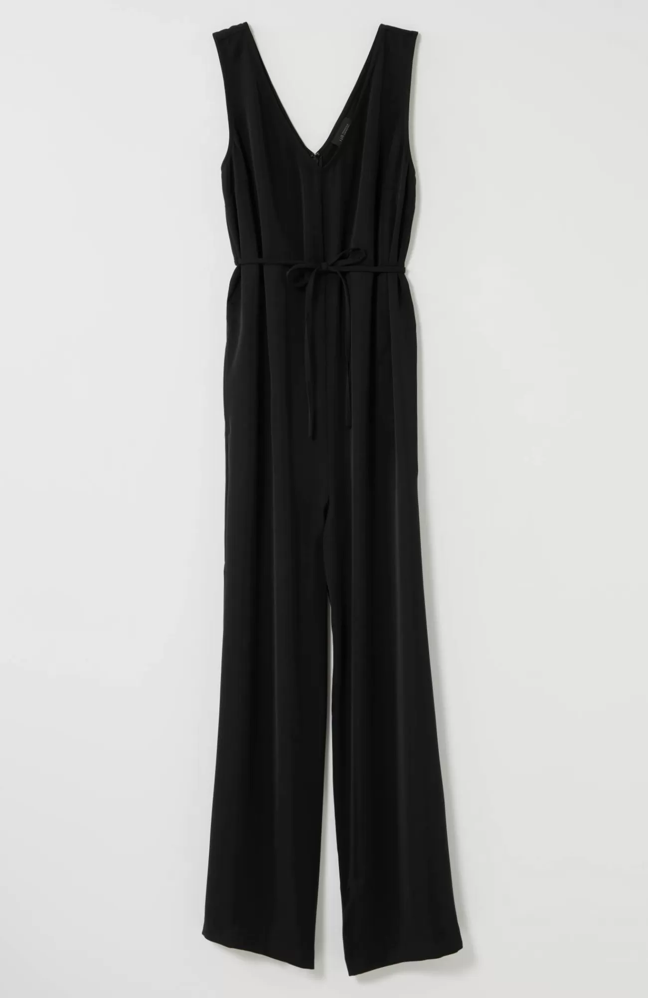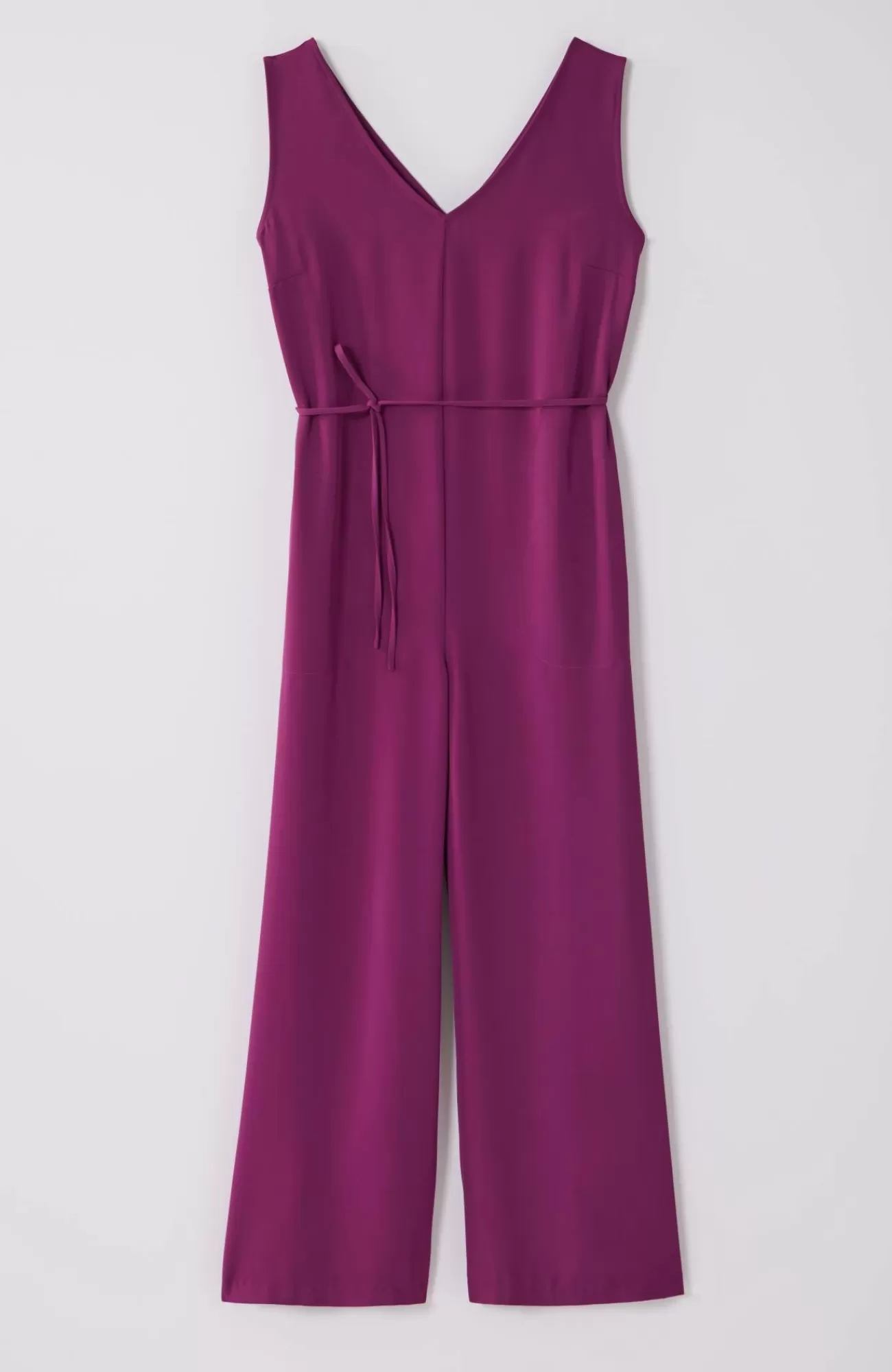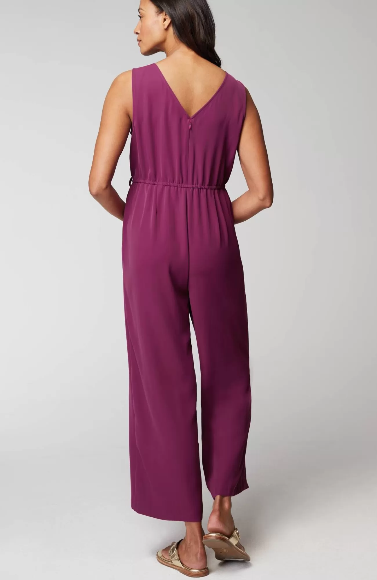 One-and-done dressing takes on a whole new level of comfort with our easy-care twill jumpsuit. You'll love the stylish double-V-neckline, while the cropped length lets you show off summer sandals or sneakers. The self-tie belt with channeled elastic at the back creates a custom flattering fit. On-seam pockets are perfect for holding small essentials. Invisible zipper at the center back. Sleeveless.