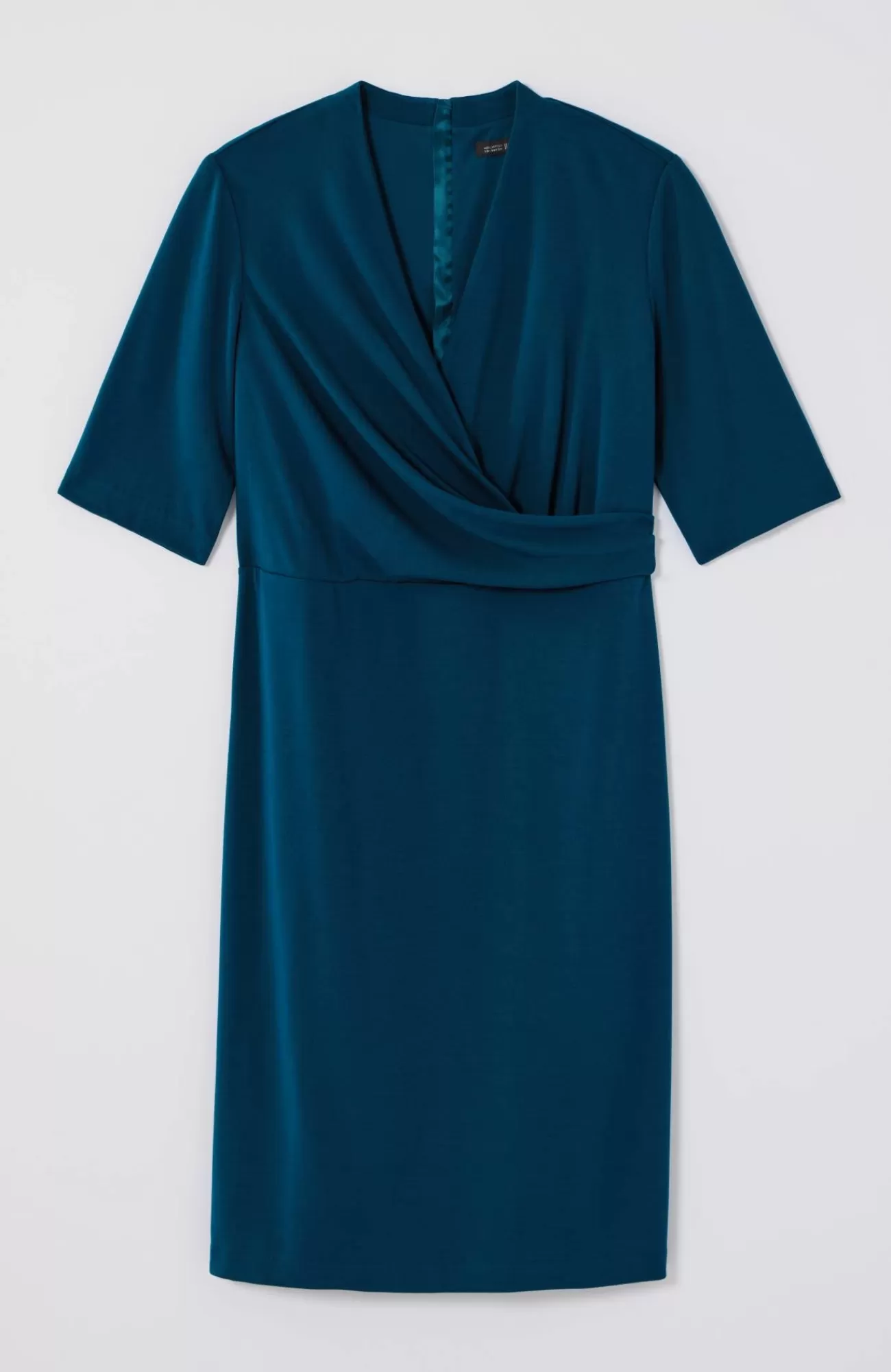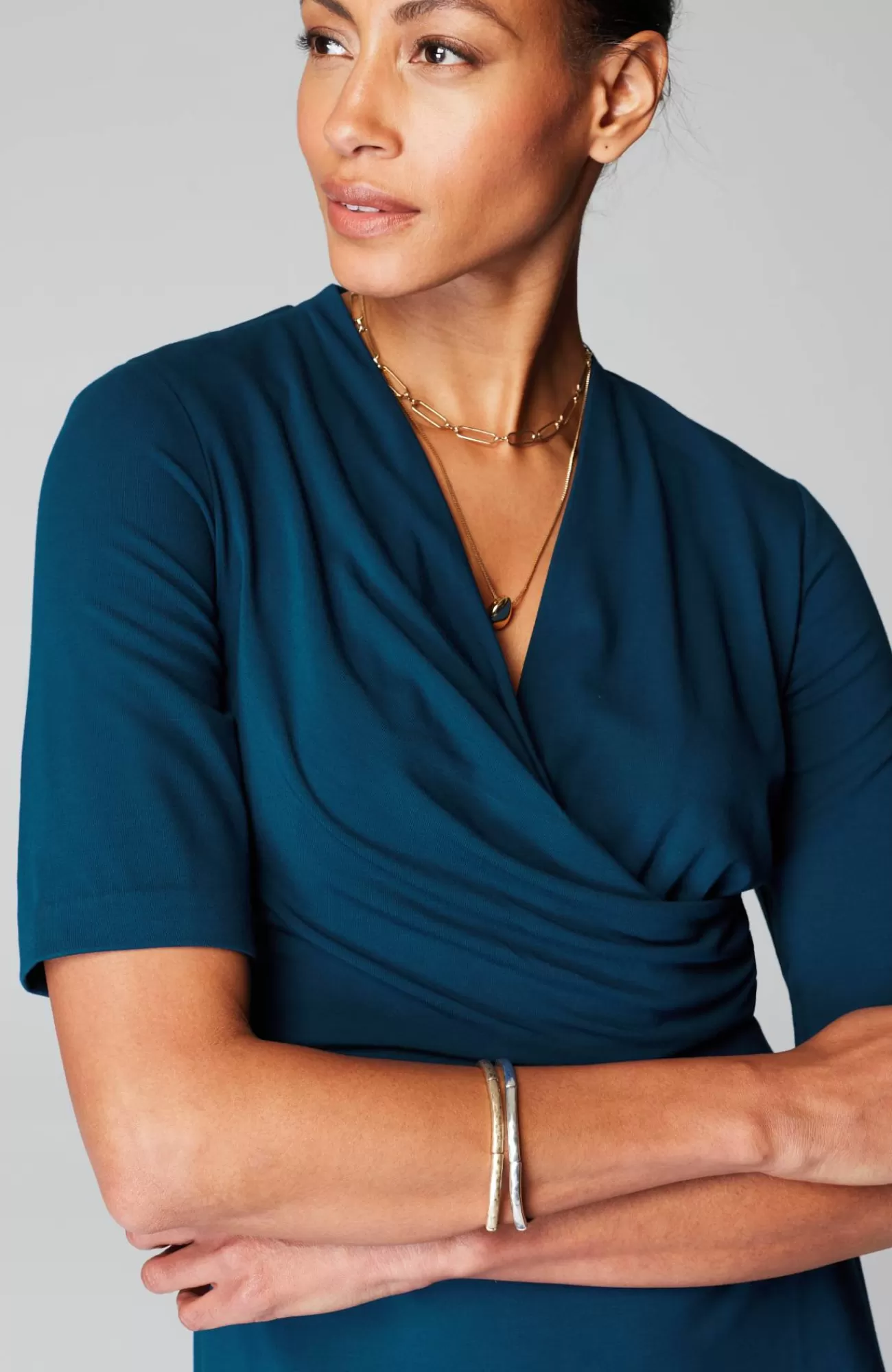Reason to throw a cocktail party: our newest waist-shaping wonder, designed with a graceful draped front, elegant elbow sleeves and hidden zipper.
