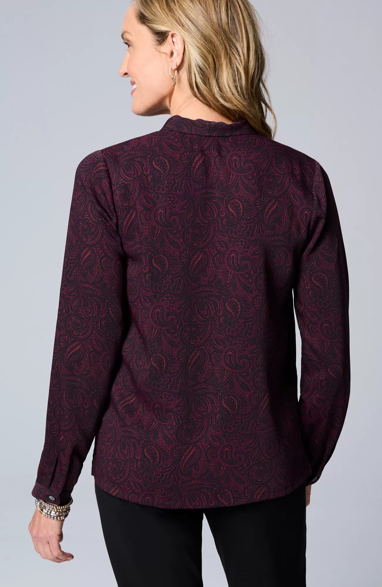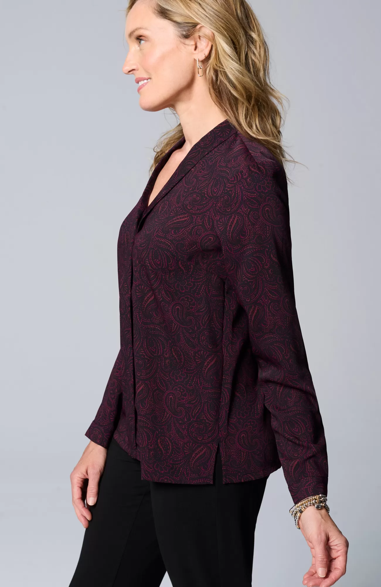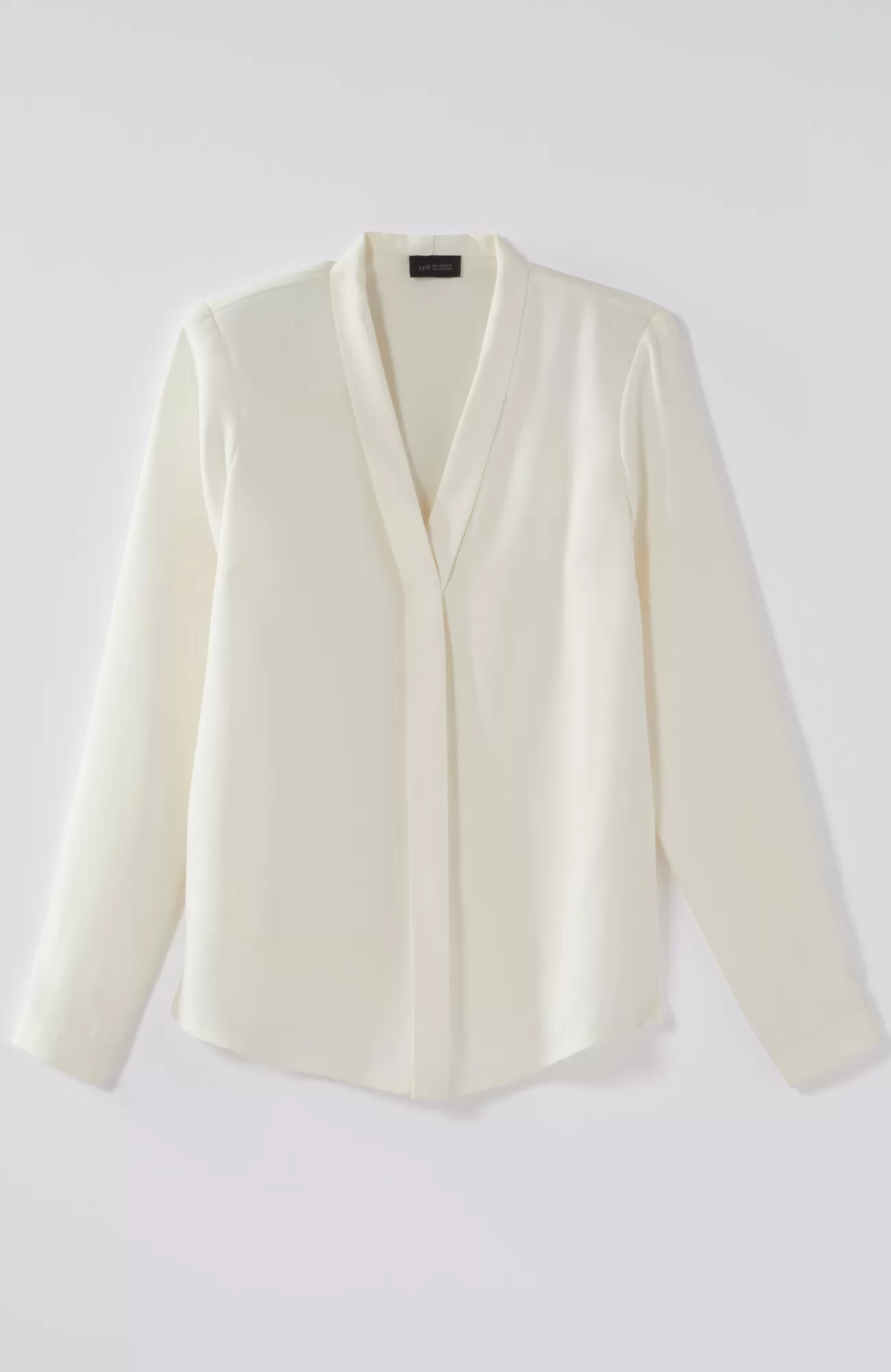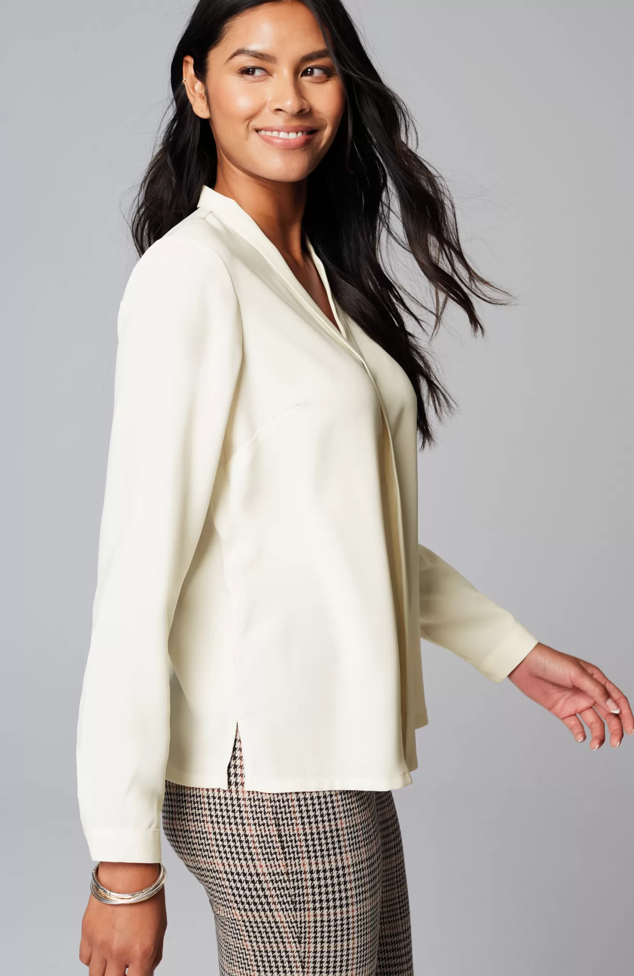 Our soft woven top is made for dressier days. The classic silhouette is elevated by bust darts, a flange detail along the front and mother-of-pearl buttoned cuffs. Made to wear under your favorite fall layers but equally stunning on its own. Side vents.