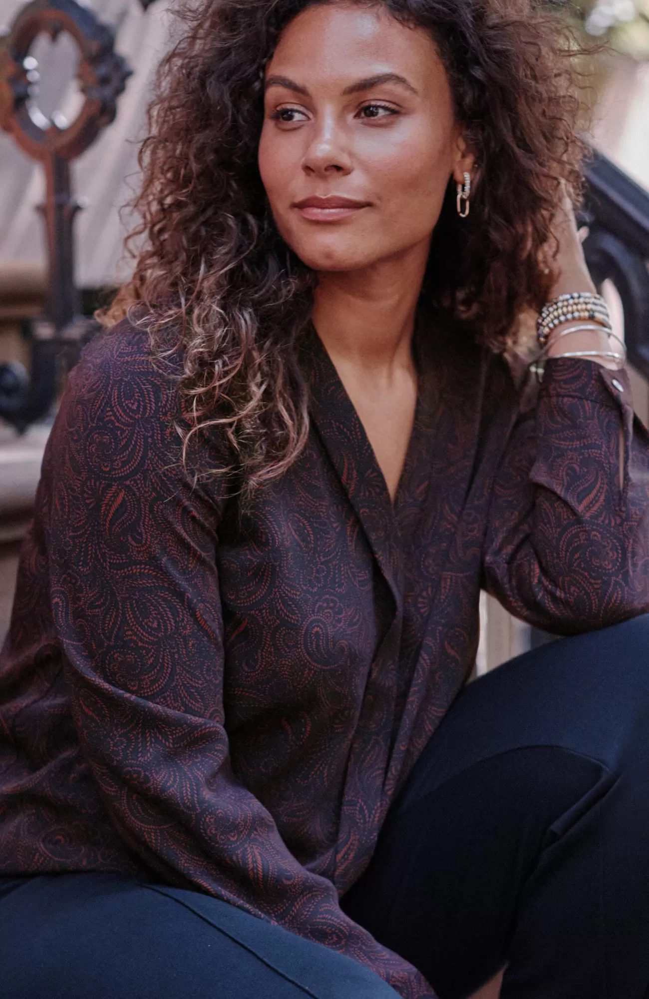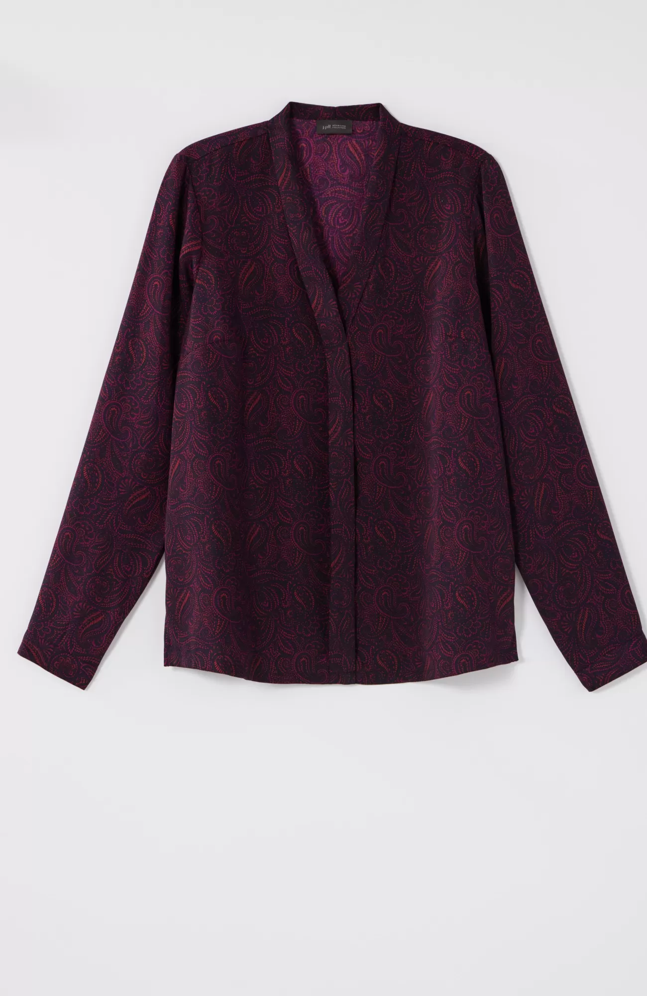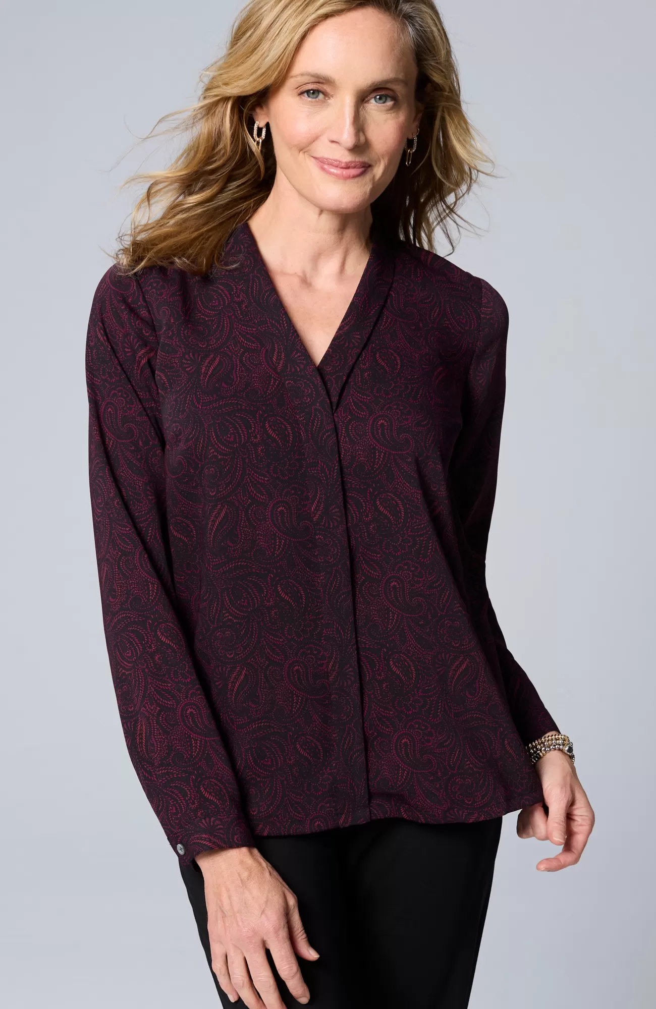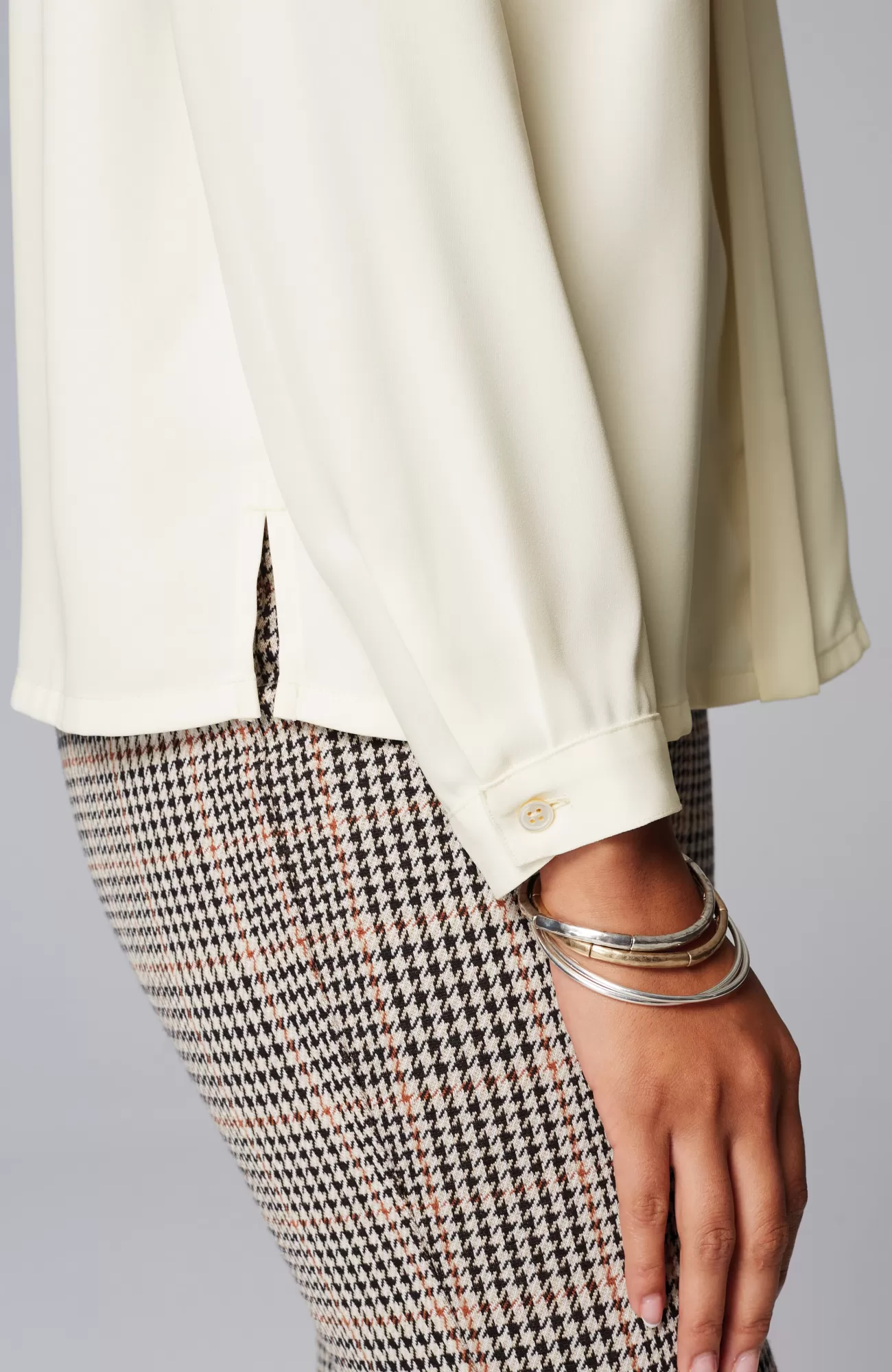 Our soft woven top is made for dressier days. The classic silhouette is elevated by bust darts, a flange detail along the front and mother-of-pearl buttoned cuffs. Made to wear under your favorite fall layers but equally stunning on its own. Side vents.