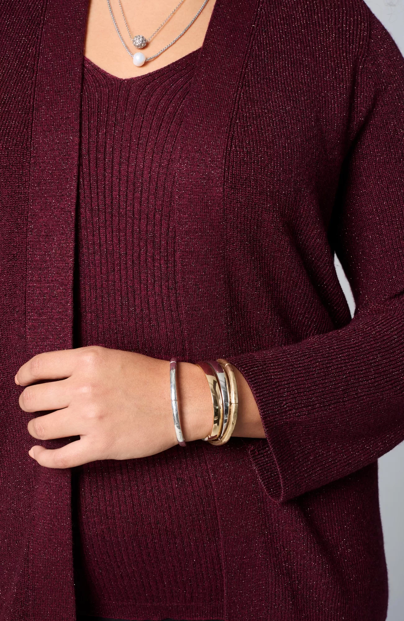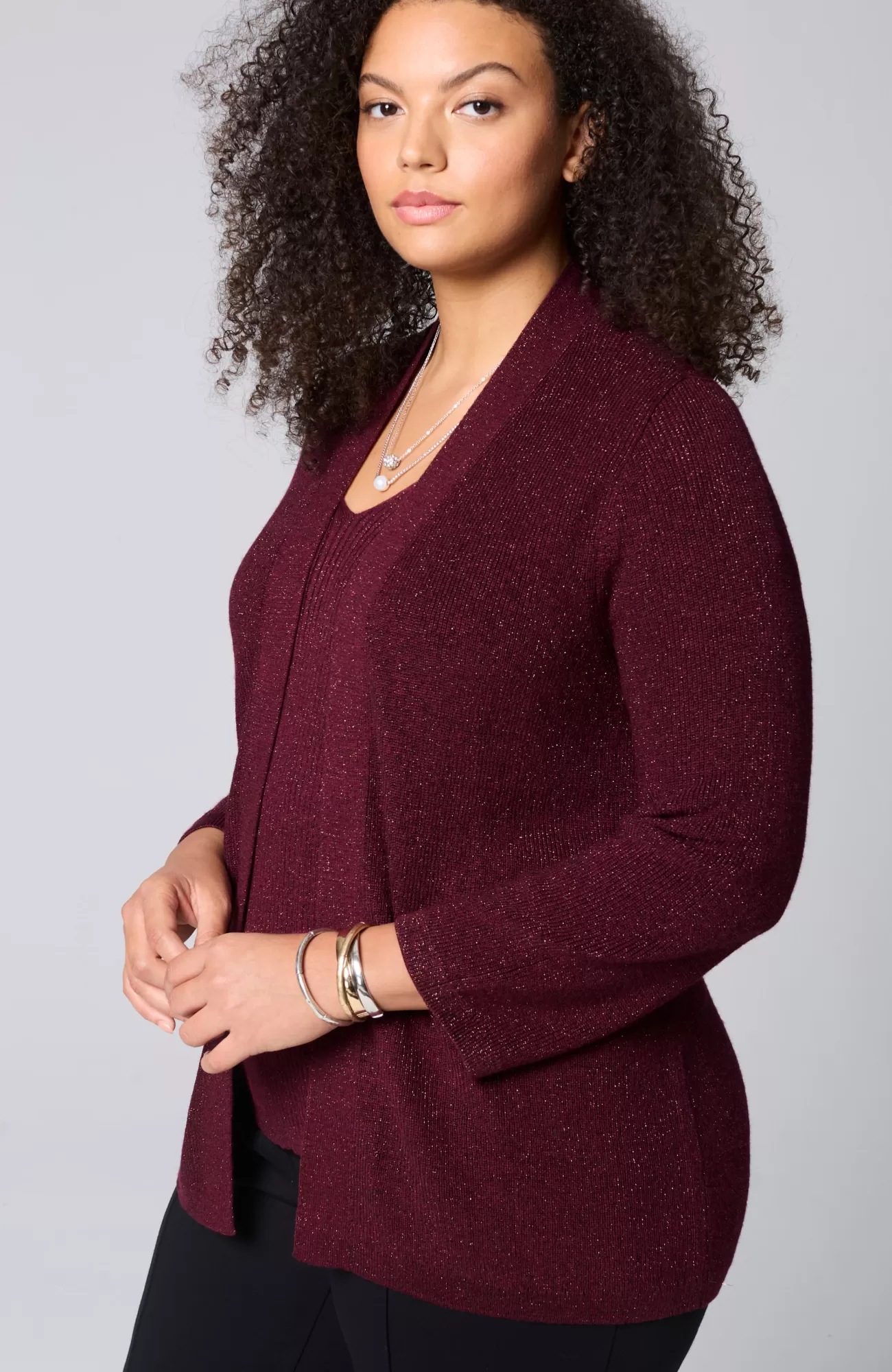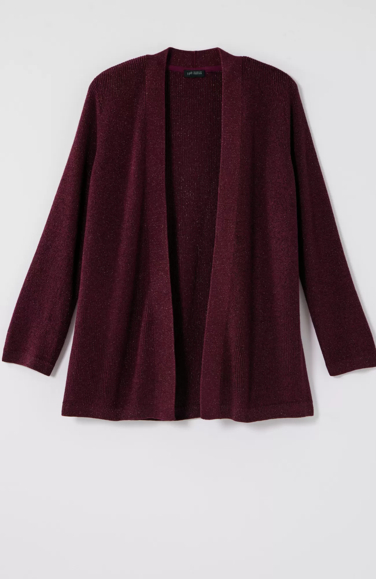 Our cozy ribbed cardi is ready for the holidays with a hint of sparkling metallic thread. It makes the perfect festive layer over your favorite dress or tee, but we recommend wearing it with our matching top for a set that truly shines. Open front. Finished with ribbed cuffs and hem. Catalog & Online Exclusive.