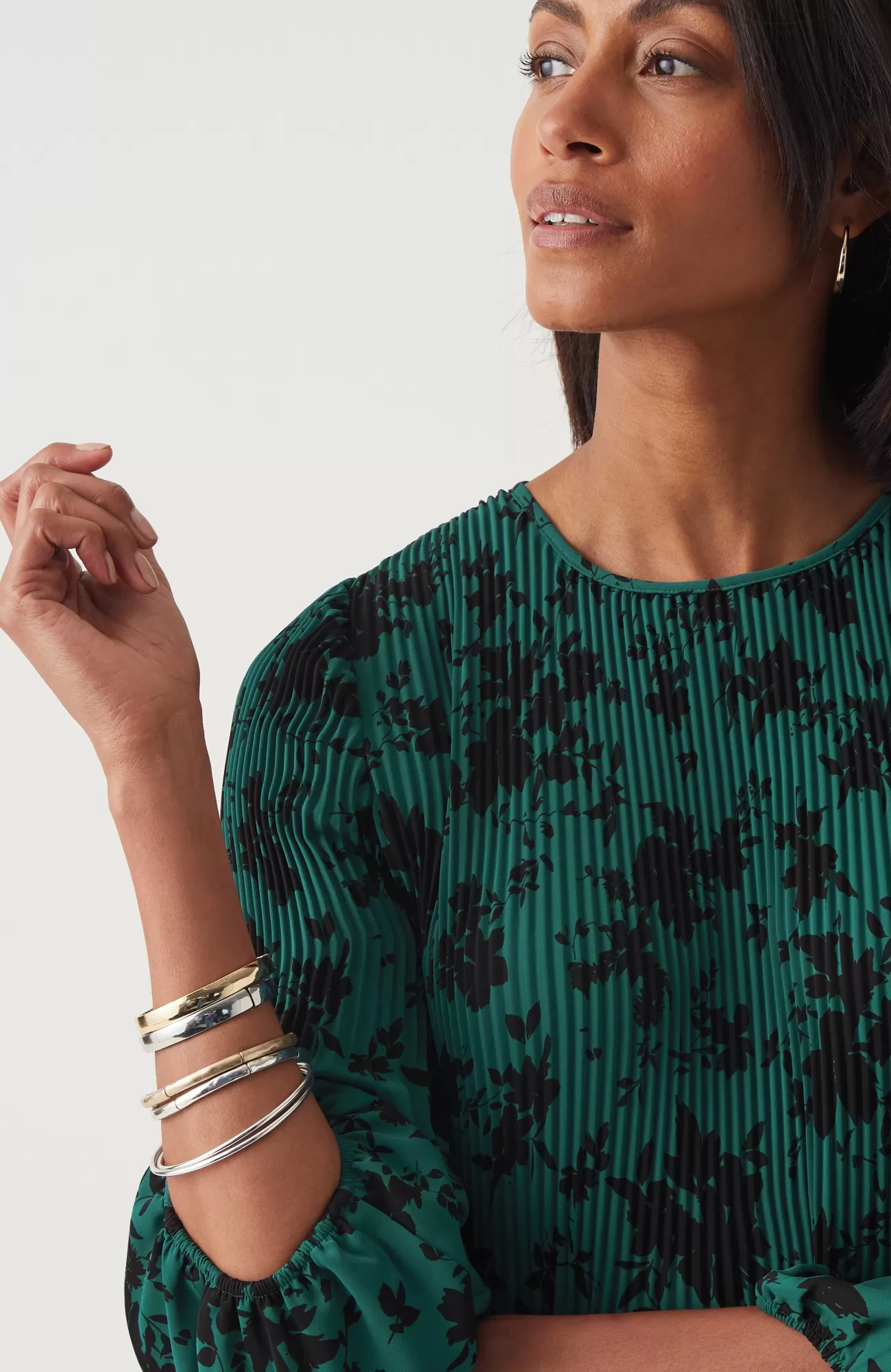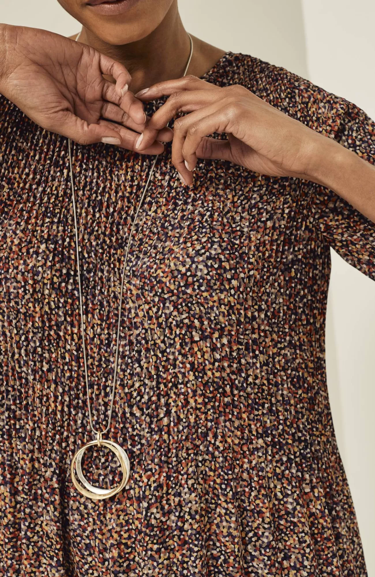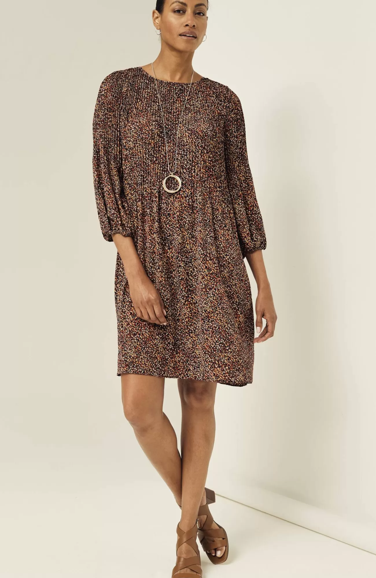 Our A-line dress makes a statement with sunburst pleats that flow with every movement. Back keyhole with button closure. Pair it with sandals or boots for workdays or weekends. Elasticized cuffs. Crew neckline.