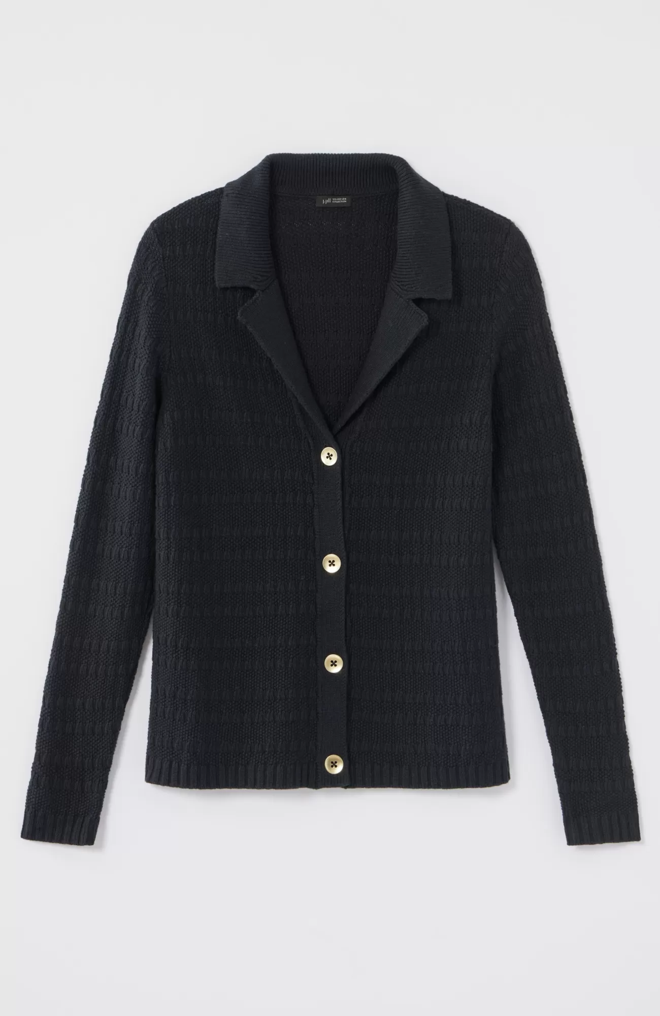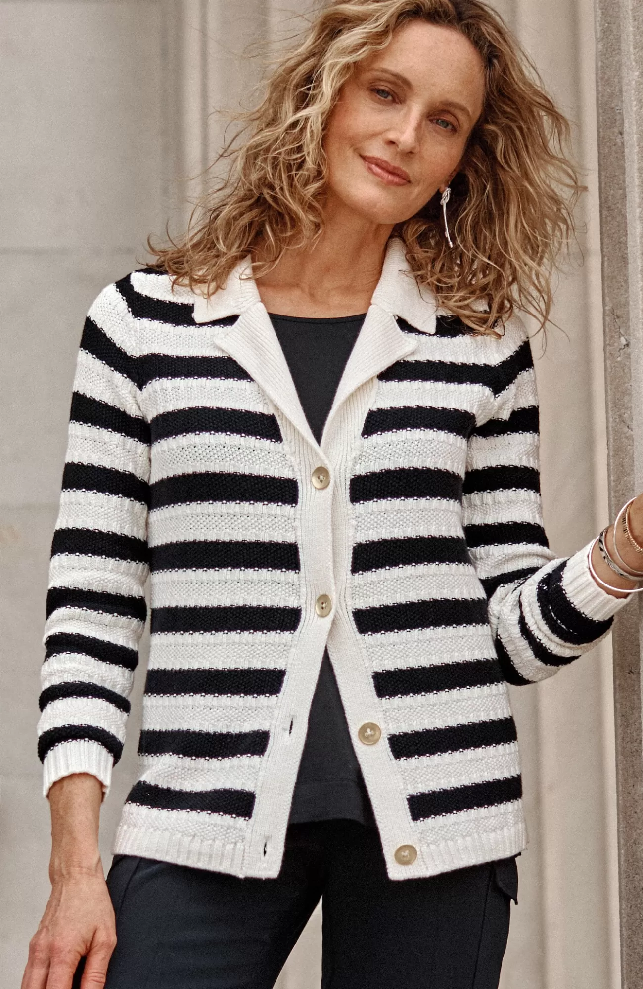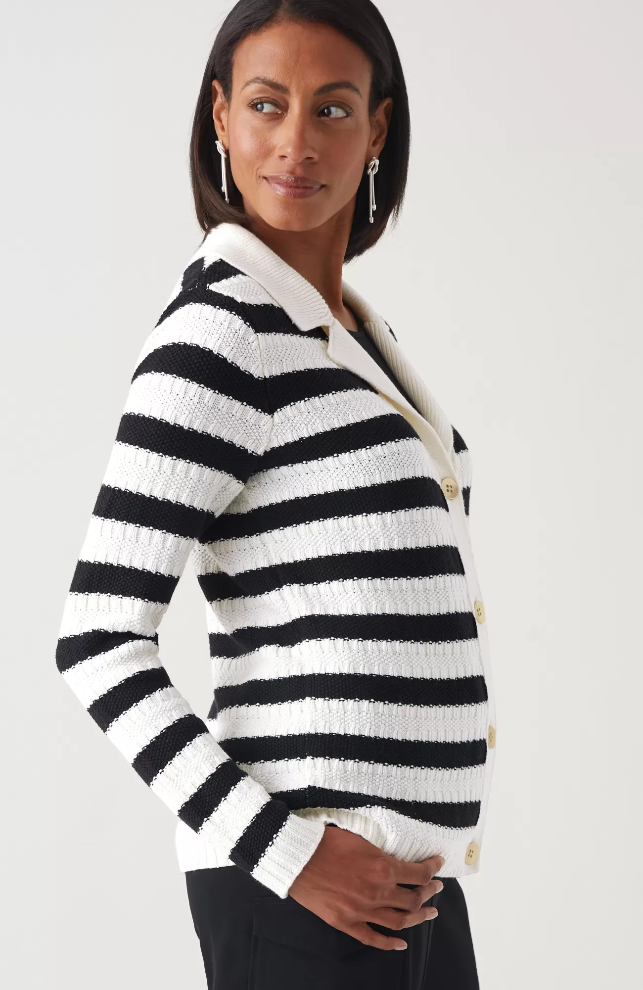 Our chic collared cardi is made to layer, love and live in. The soft and cozy stitched texture is refined with ribbed trim and metal buttons. Plus, the neutral tones pair with so much in your wardrobe—just pick solid or stripe.