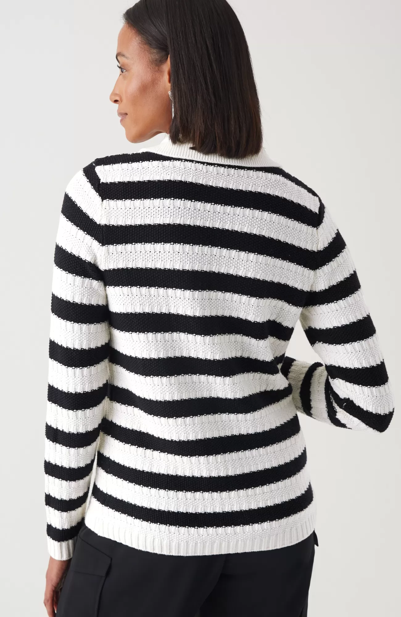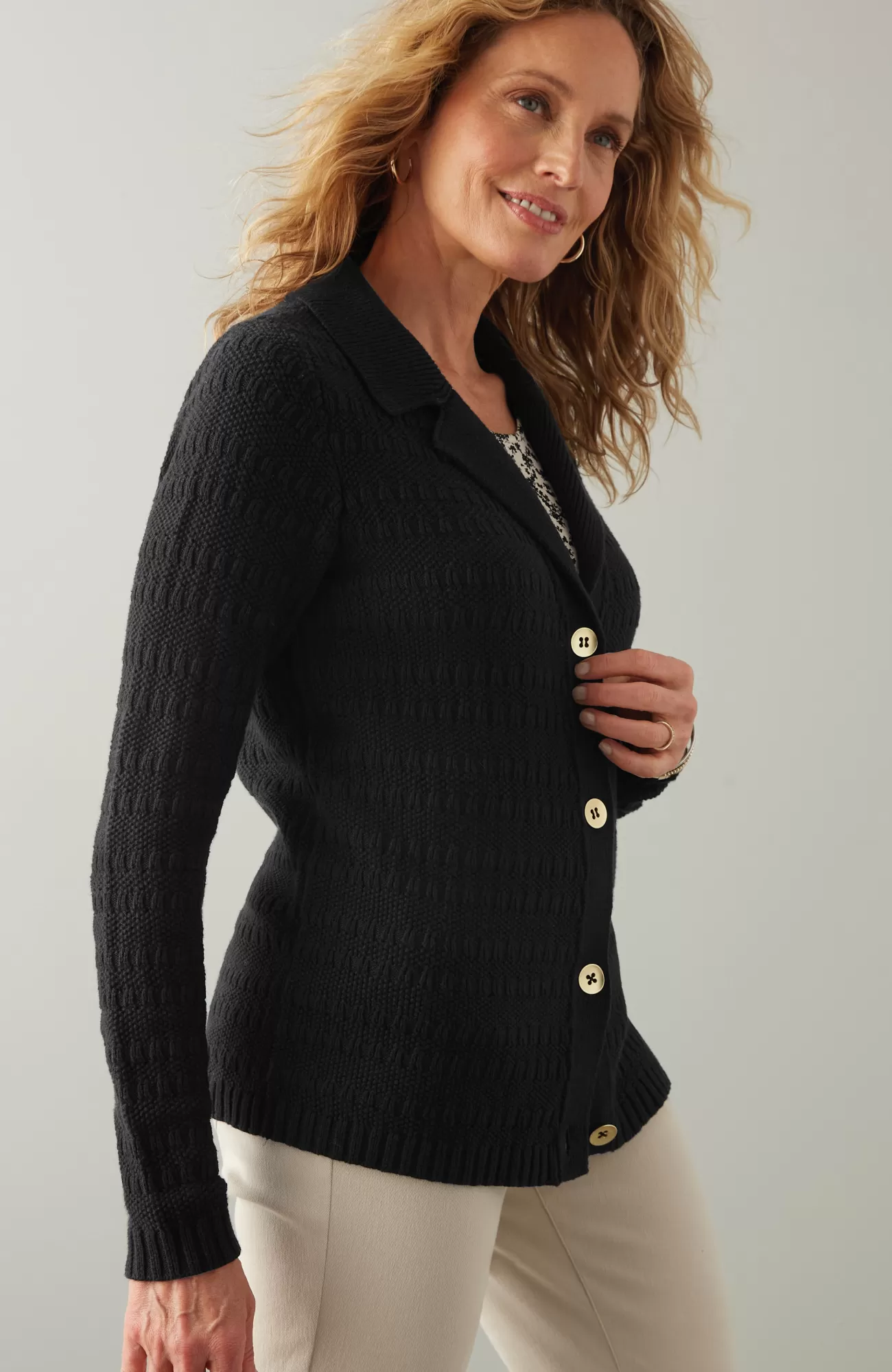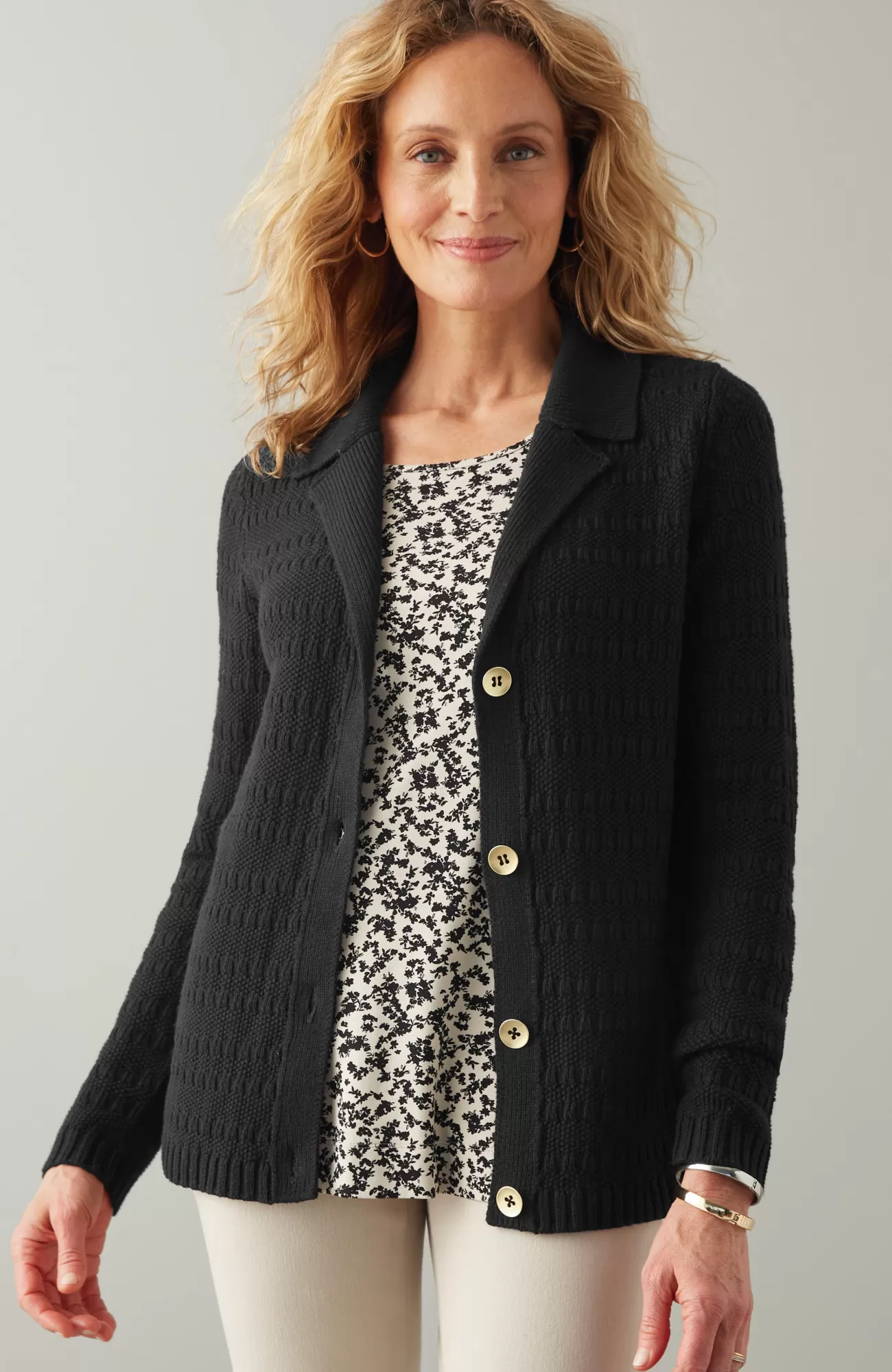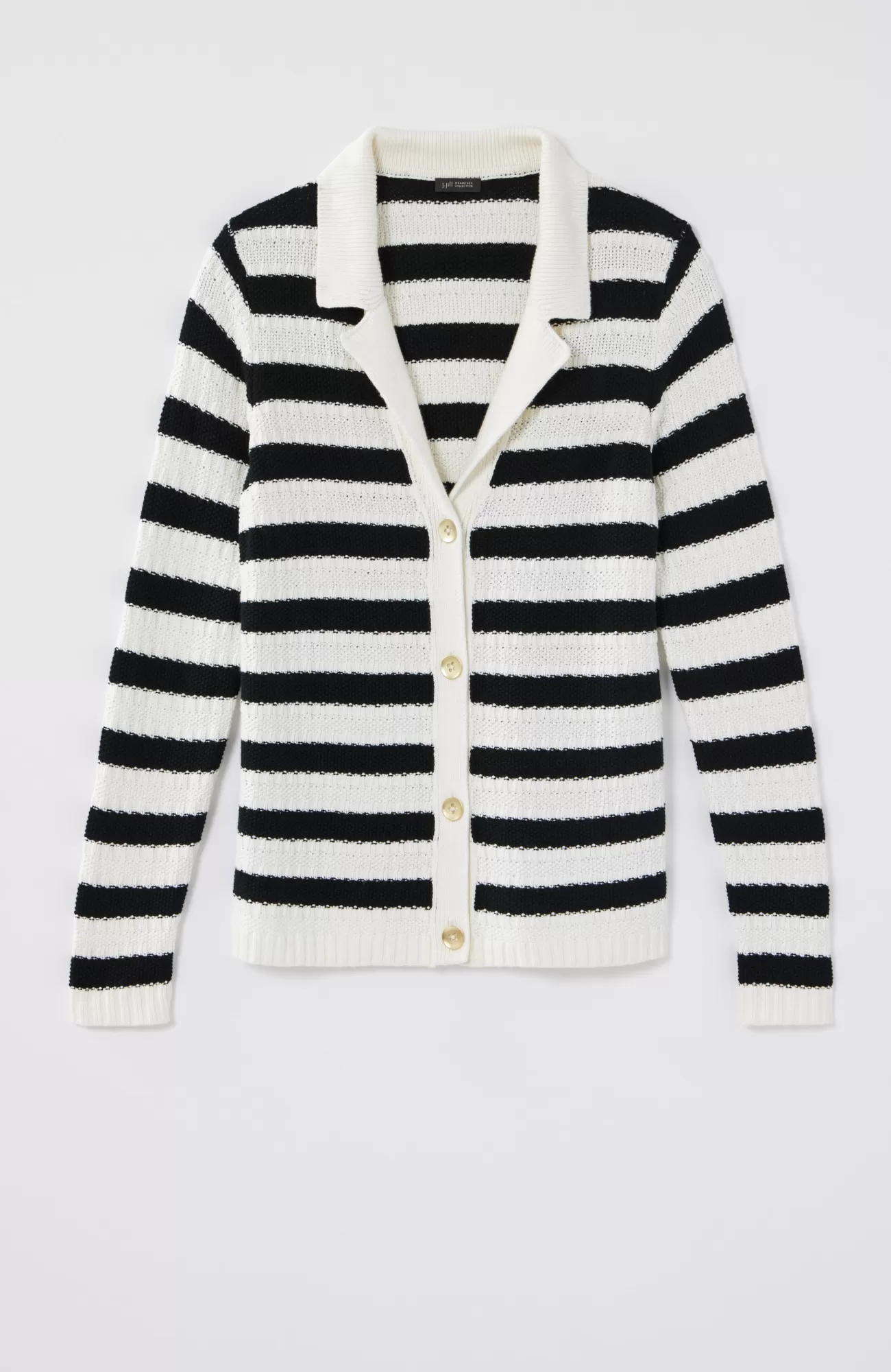 Our chic collared cardi is made to layer, love and live in. The soft and cozy stitched texture is refined with ribbed trim and metal buttons. Plus, the neutral tones pair with so much in your wardrobe—just pick solid or stripe.